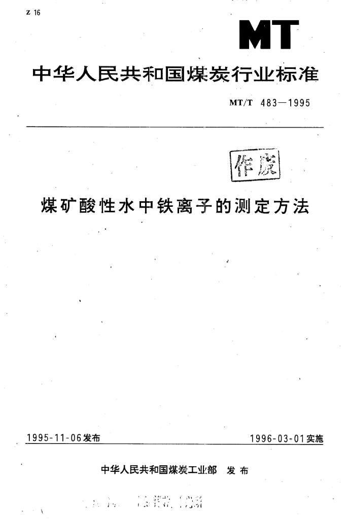 MT/T 483-1995 煤矿酸性水中铁离子的测定方法
