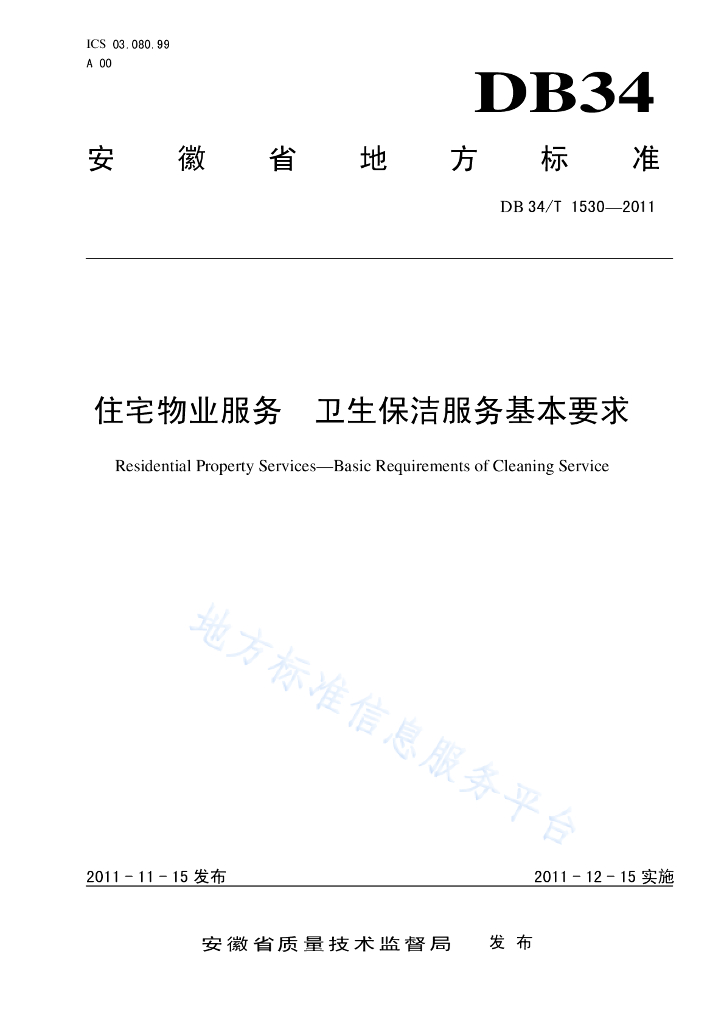 DB34/T 1530-2011 住宅物业服务 卫生保洁服务基本要求