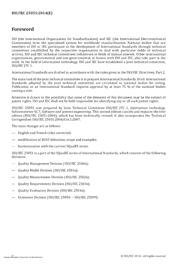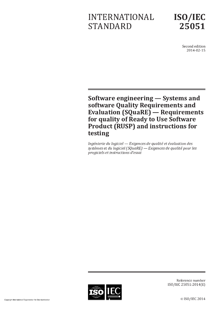 ISO/IEC 25051-2014 软件工程 系统和软件的质量要求和评估(广场) 对于准备使用的软件产品(RUSP)的质量要求和测试说明