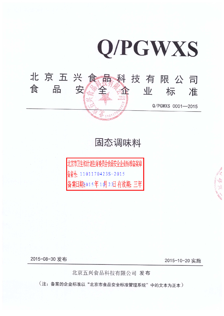 Q/PGWXS 0001-2015 北京市五兴食品科技有限公司 固态调味料