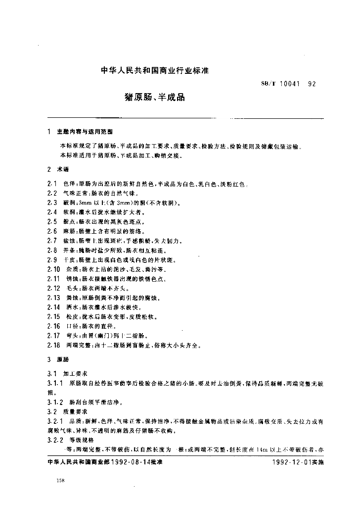 SB/T 10041-1992 猪原肠、半成品