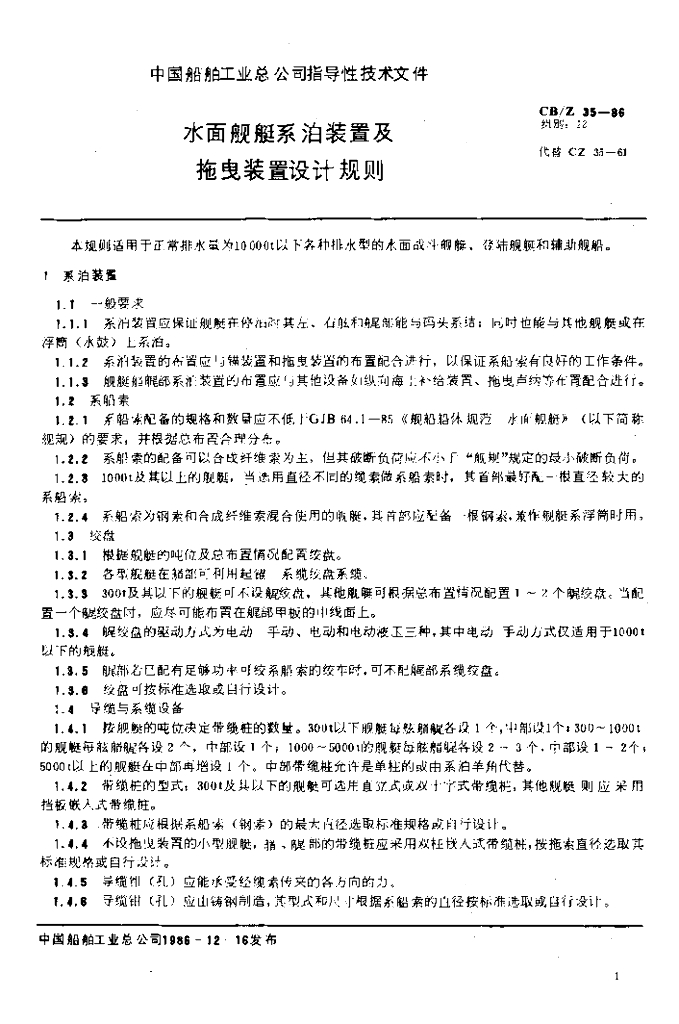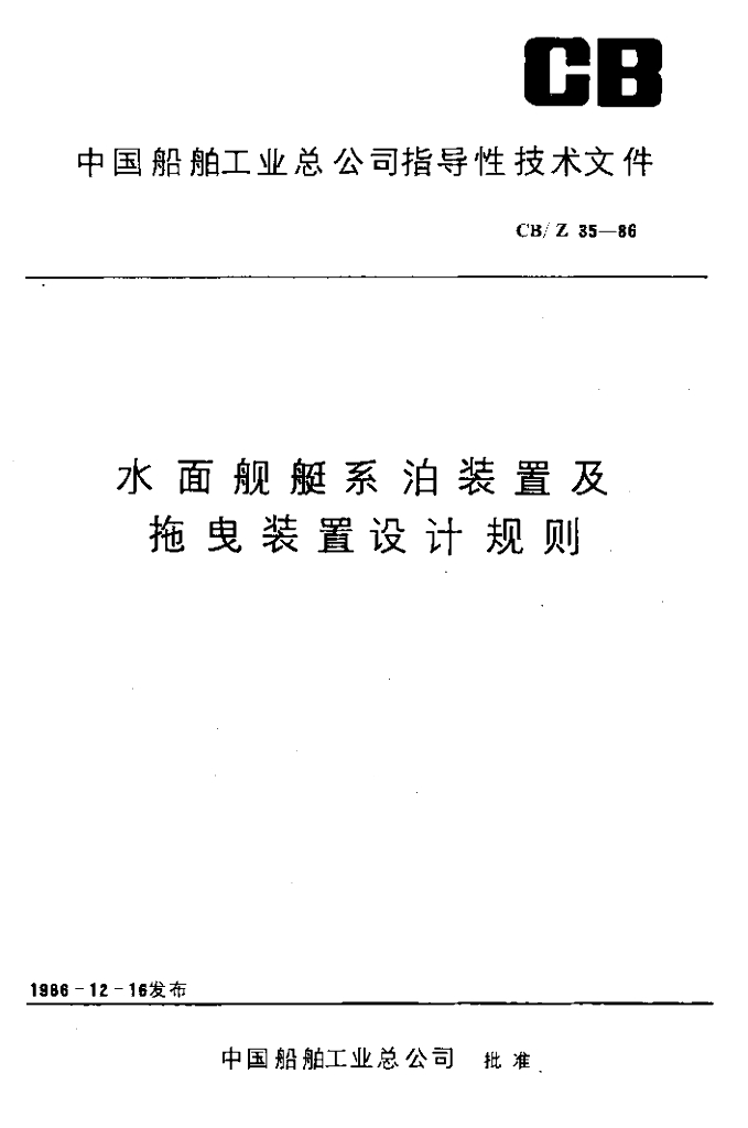 CB/Z 35-1986 水面舰艇系泊装置及拖曳装置设计规则