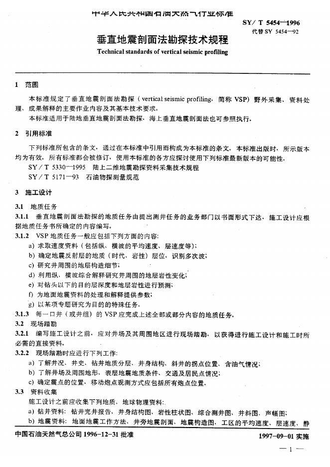 SY 5454-1992 垂直地震剖面法勘探技术规程