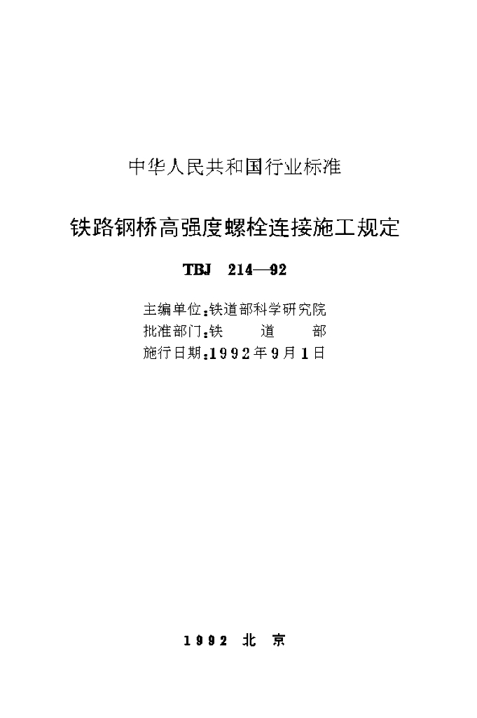 TBJ 214-1992 铁路钢桥高强度螺栓连接施工规定