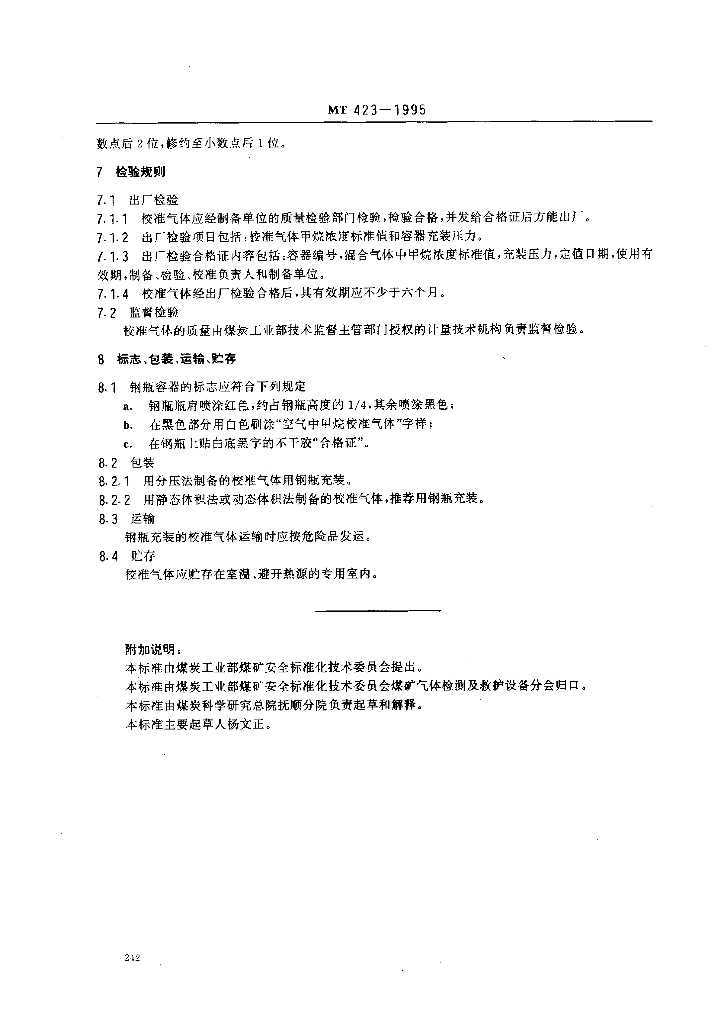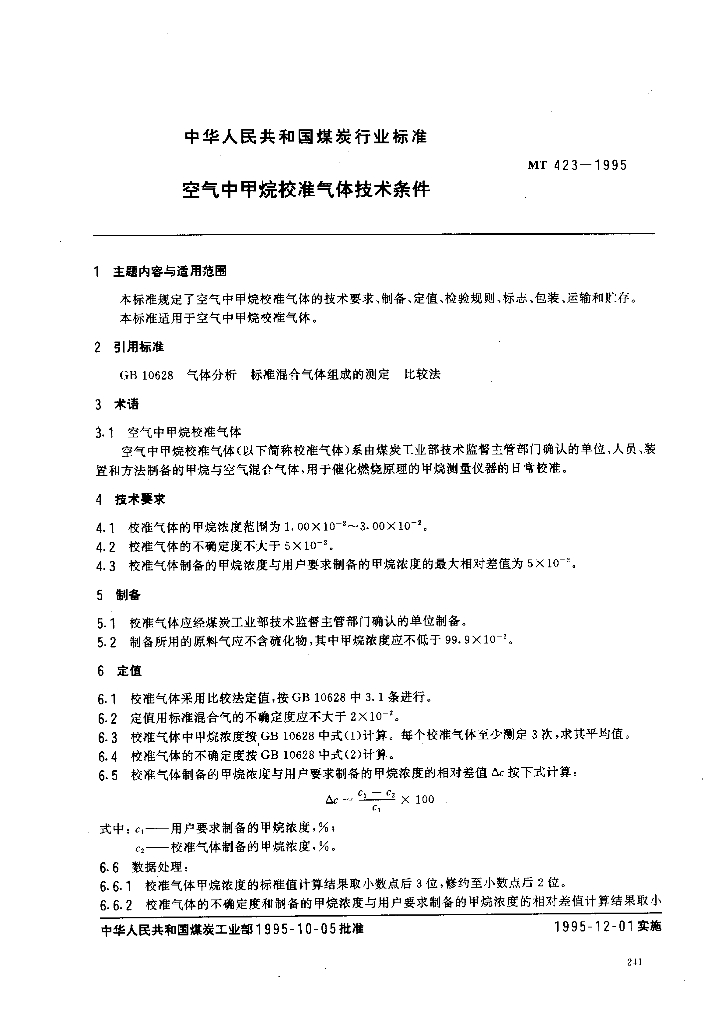 MT 423-1995 空气中甲烷校准气体技术条件