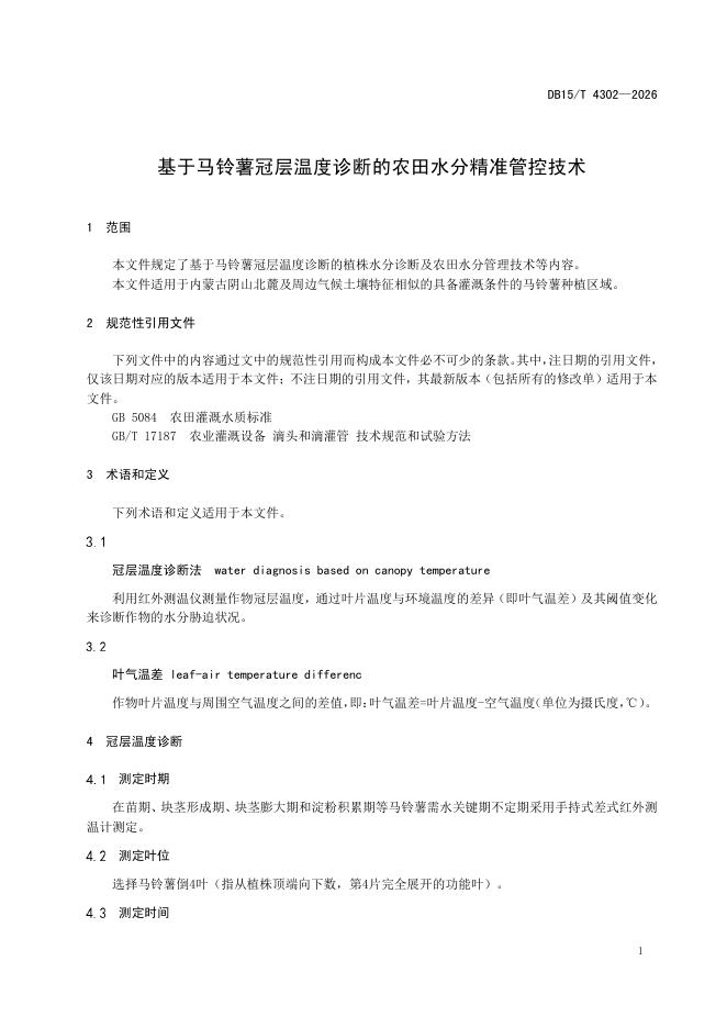 DB15/T 4302-2026 基于马铃薯冠层温度诊断的农田水分精准管控技术