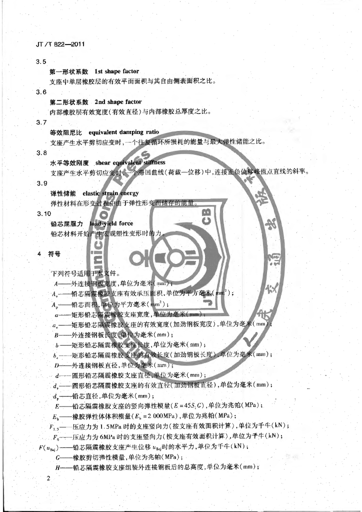 JT/T 822-2011 公路桥梁铅芯隔震橡胶支座