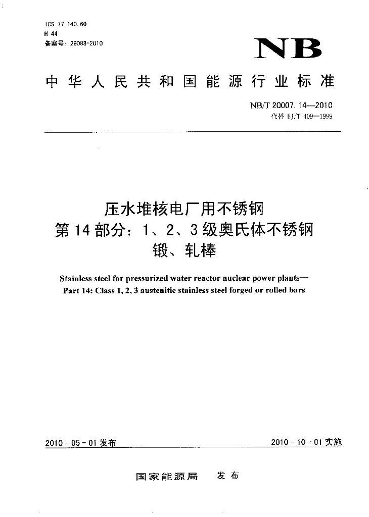 NB/T 20007.14-2010 压水堆核电厂用不锈钢 第14部分:1、2、3级奥氏体不锈钢锻、轧棒