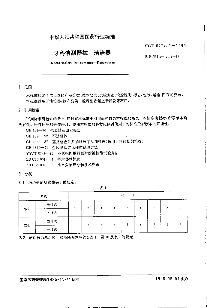 YY/T 0274.1-1995 牙科洁刮器械洁治器