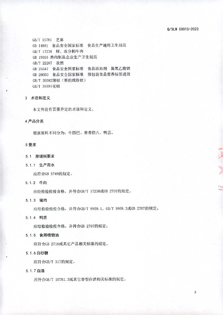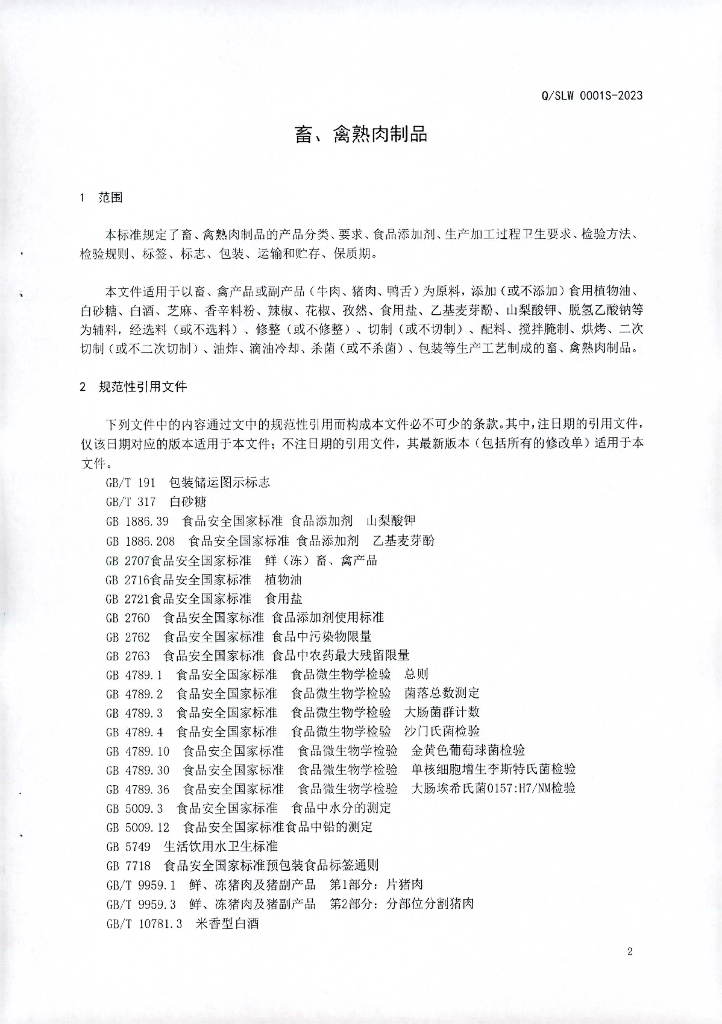 Q/SLW 0001S-2023 畜、禽熟肉制品