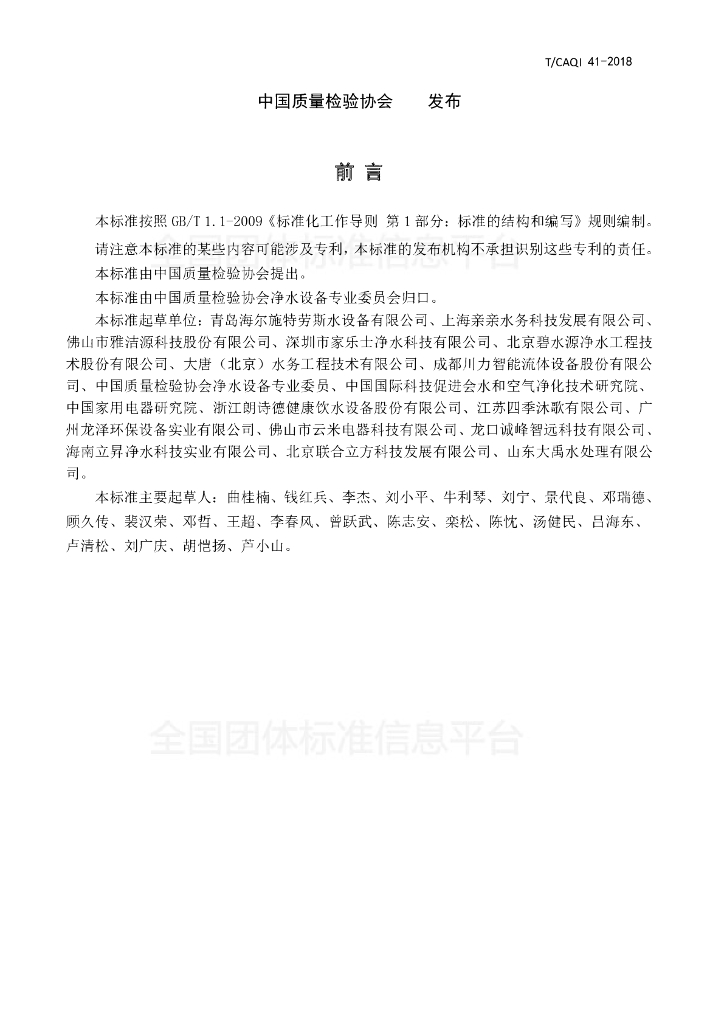 青岛海尔施特劳斯水设备有限公司、上海亲亲水务科技发展有限公司、佛山市雅洁源科技股份有限公司、深圳市家乐士净水科技有限公司、北京碧水源净水工程技术股份有限公司、大唐(北京)水务工程技术有限公司、成都川力智能流体设备股份有限公司、中国质量检验协会净水设备专业委员、中国国际科技促进会水和空气净化技术研究院、中国家用电器研究院、浙江朗诗德健康饮水设备股份有限公司、江苏四季沐歌有限公司、广州龙泽环保设备实业有限公司、佛山市云米电器科技有限公司、龙口诚峰智远科技有限公司、海南立昇净水科技实业有限公司、北京联合立方科技