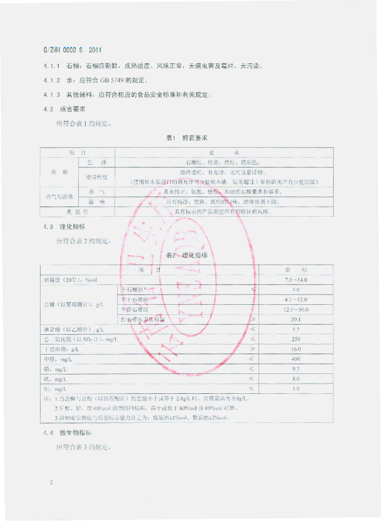 Q/ZHH 0002S-2011 石榴酒(发酵酒)