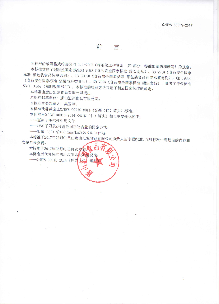 Q/HYS 0001S-2017 板栗(仁)罐头