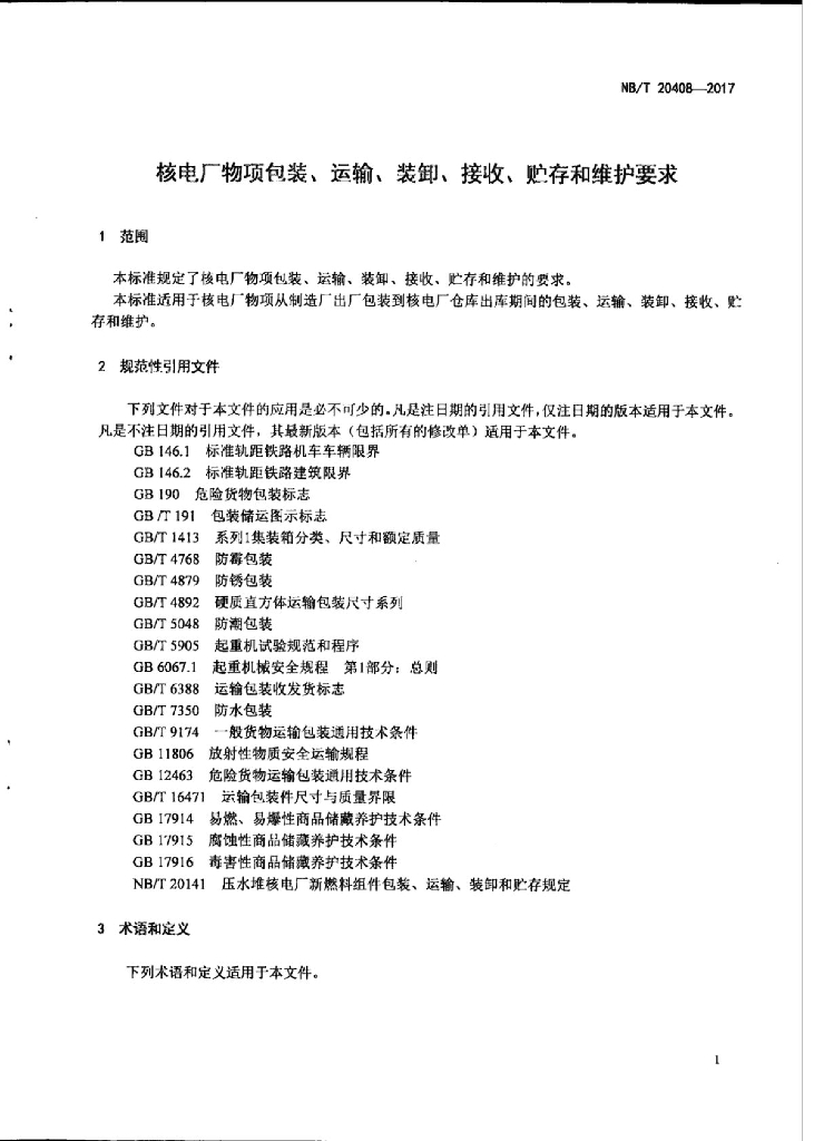 NB/T 20408-2017 核电厂物项包装、运输、装卸、接收、贮存和维护要求