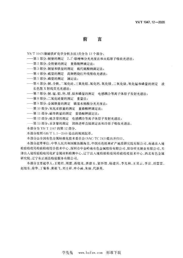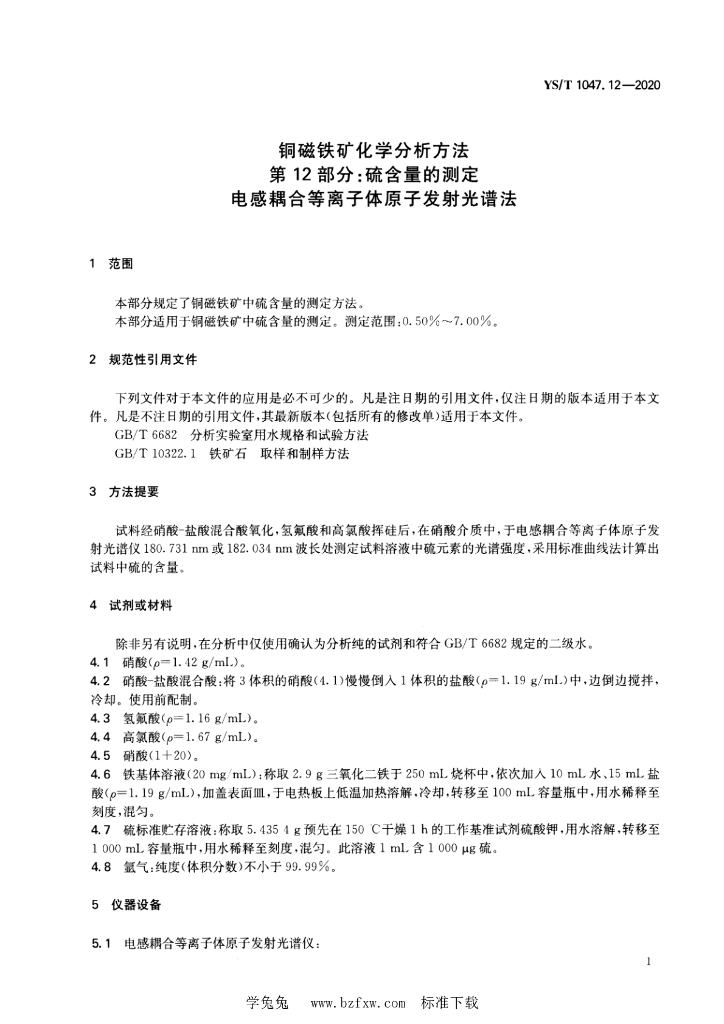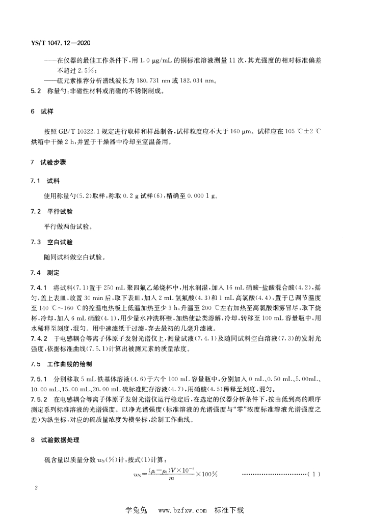 YS/T 1047.12-2020 铜磁铁矿化学分析方法 第12部分:硫含量的测定 电感耦合等离子体原子发射光谱法
