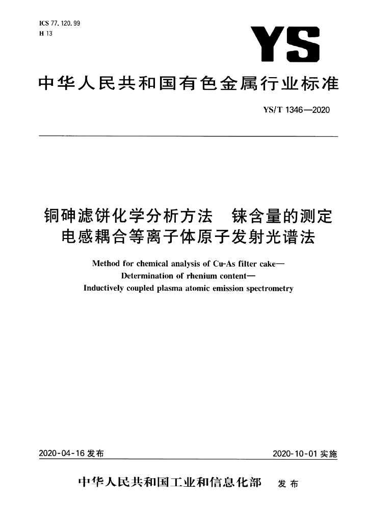 YS/T 1346-2020 铜砷滤饼化学分析方法 铼含量的测定 电感耦合等离子体原子发射光谱法