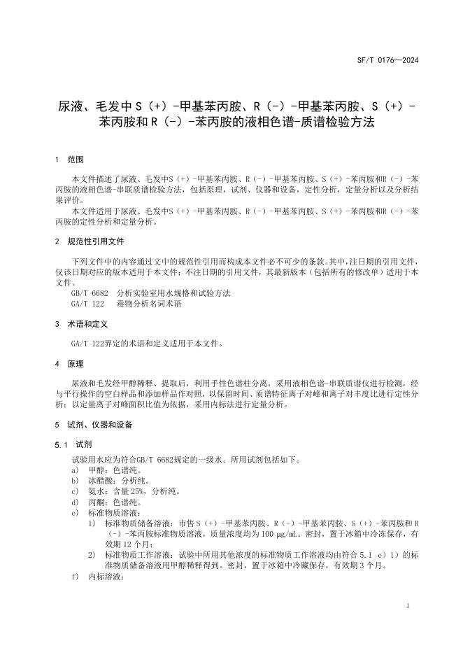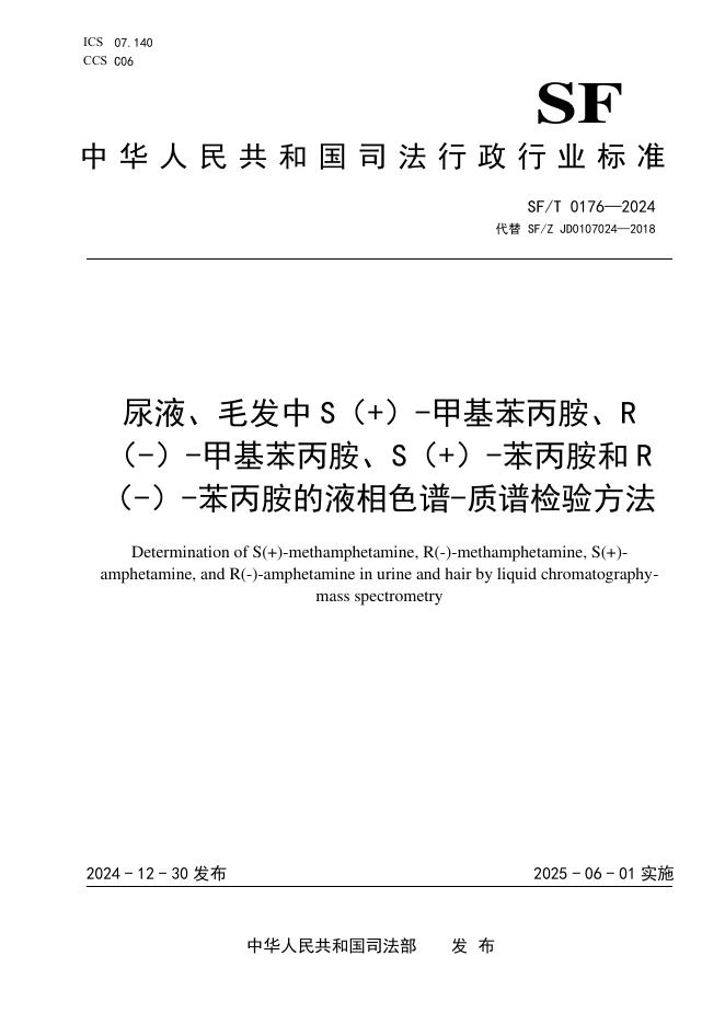 SF/T 0176-2024 尿液、毛发中S(+)-甲基苯丙胺、R(-)-甲基苯丙胺、S(+)-苯丙胺和R(-)-苯丙胺的液相色谱-质谱检验方法