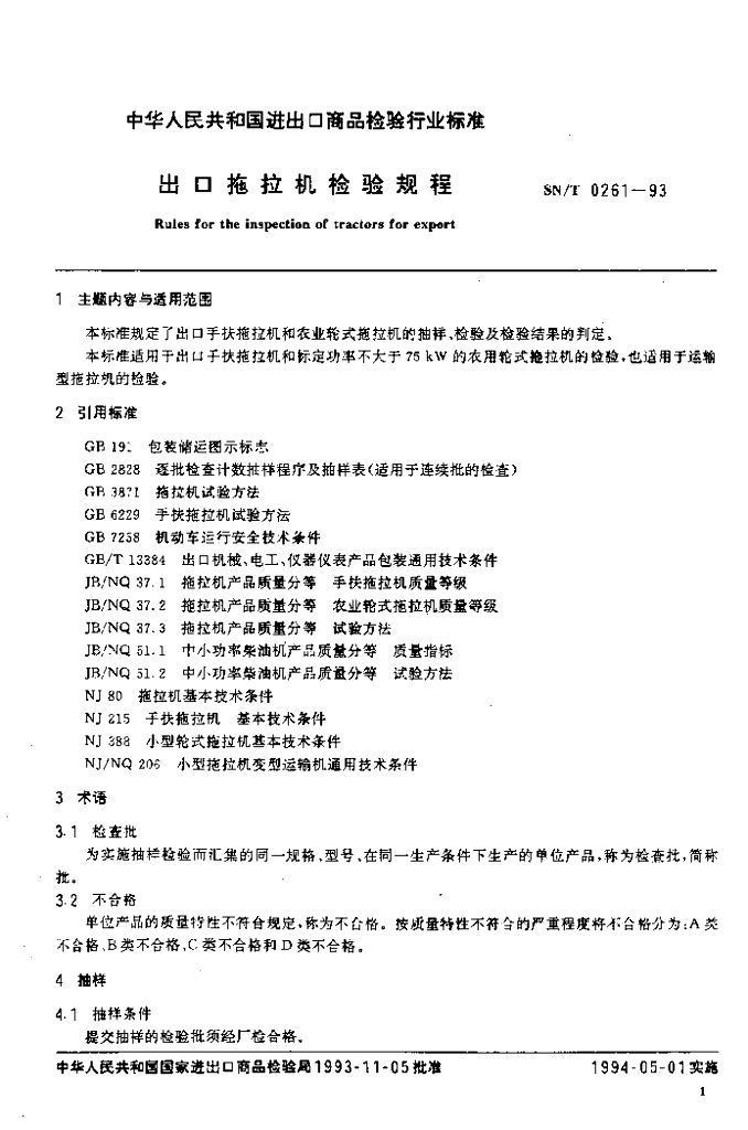 SN/T 0261-1993 出口拖拉机检验规程