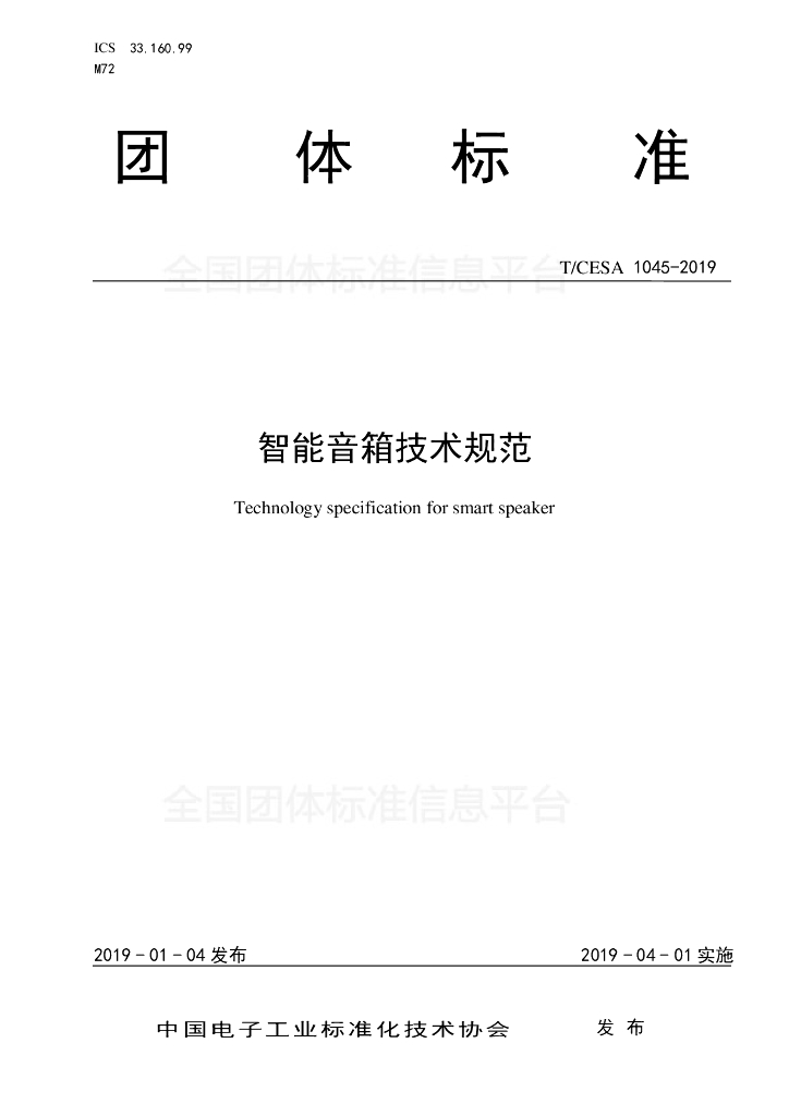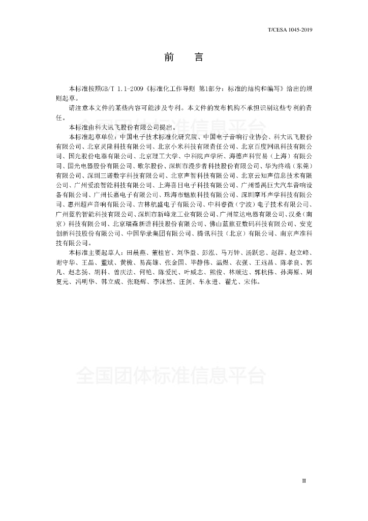 中国电子技术标准化研究院、中国电子音响行业协会、科大讯飞股份有限公司、北京灵隆科技有限公司、北京小米科技有限责任公司、北京百度网讯科技有限公司、国光股份电器有限公司、北京理工大学、中科院声学所、海德声科贸易(上海)有限公司、国光电器股份有限公司、歌尔股份、深圳市漫步者科技股份有限公司、华为终端(东莞)有限公司、深圳三诺数字科技有限公司、北京声智科技有限公司、北京云知声信息技术有限公司、广州爱浪智能科技有限公司、上海喜日电子科技有限公司、广州番禺巨大汽车音响设备有限公司、广州长嘉电子有限公司、珠海市魅族科技
