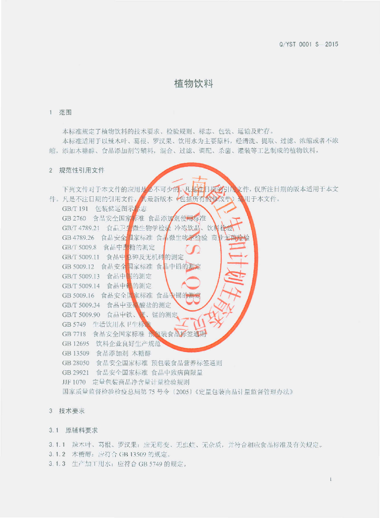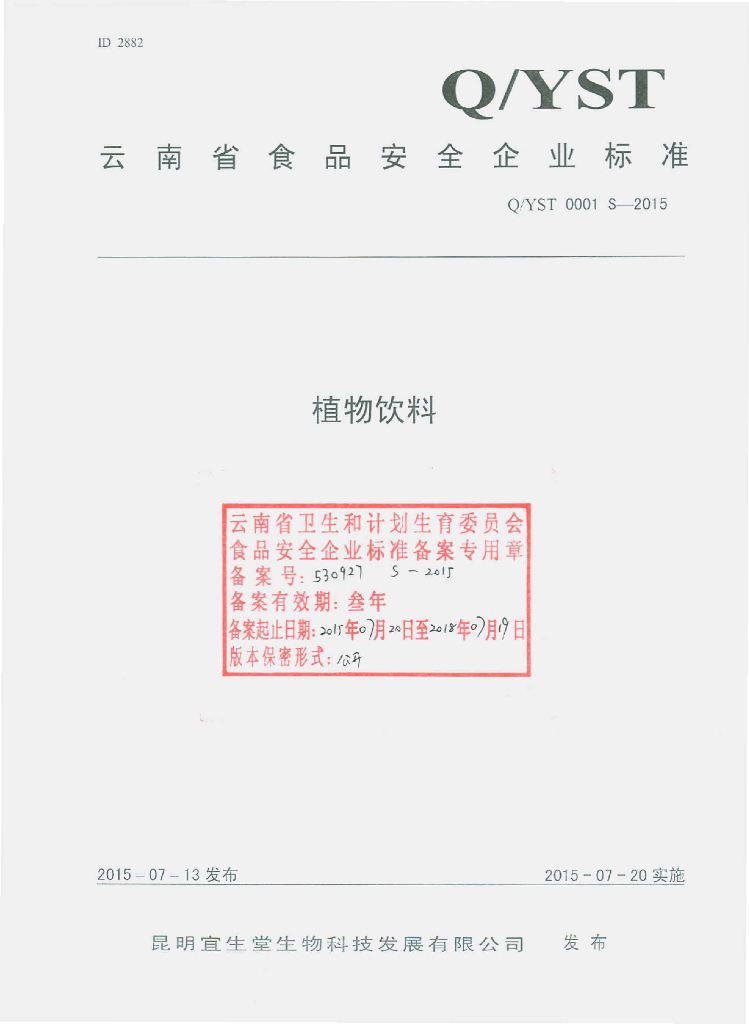 Q/YST 0001S-2015 昆明易生堂生物科技发展有限公司 植物饮料