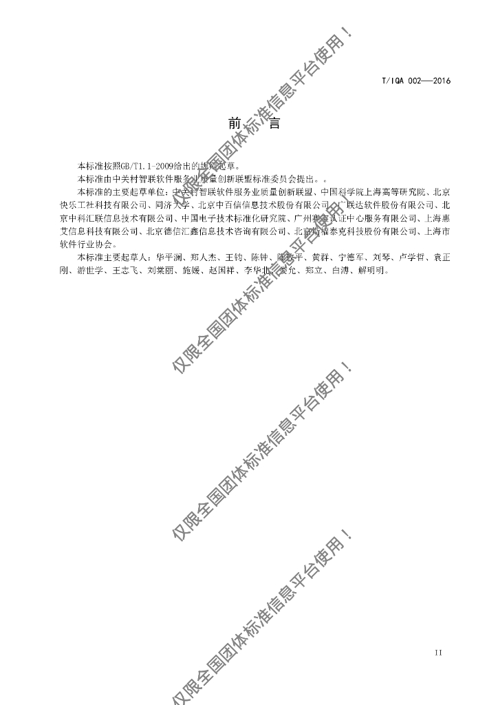 中关村智联软件服务业质量创新联盟、 中国科学院上海高等研究院、 北京快乐工社科技有限公司、 同济大学、 北京中百信信息技术股份有限公司、 广联达软件股份有限公司、 北京中科汇联信息技术有限公司、 中国电子技术标准化研究院、 广州赛宝认证中心服务有限公司、 上海惠艾信息科技有限公司、 北京德信汇鑫信息技术咨询有限公司、 北京斯福泰克科技股份有限公司、 上海市、软件行业协会。