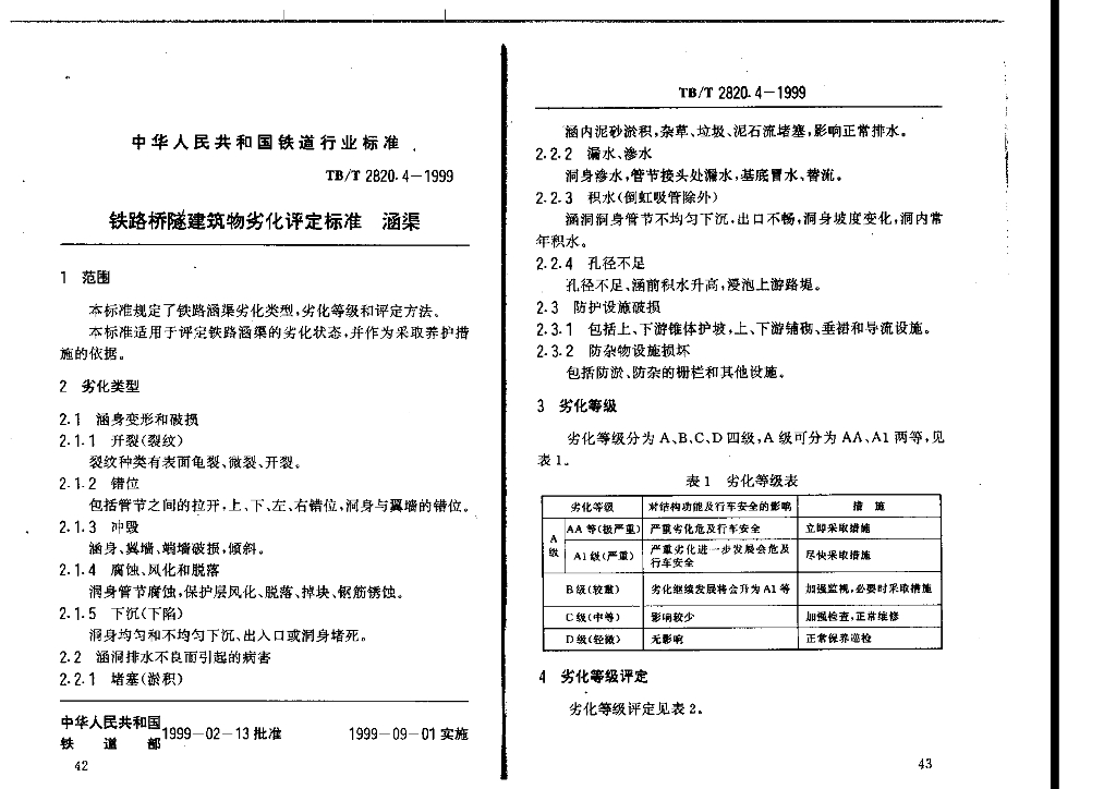 TB/T 2820.4-1999 铁路桥隧建筑物劣化评定标准 涵渠