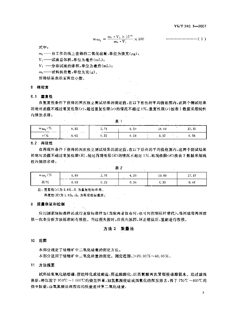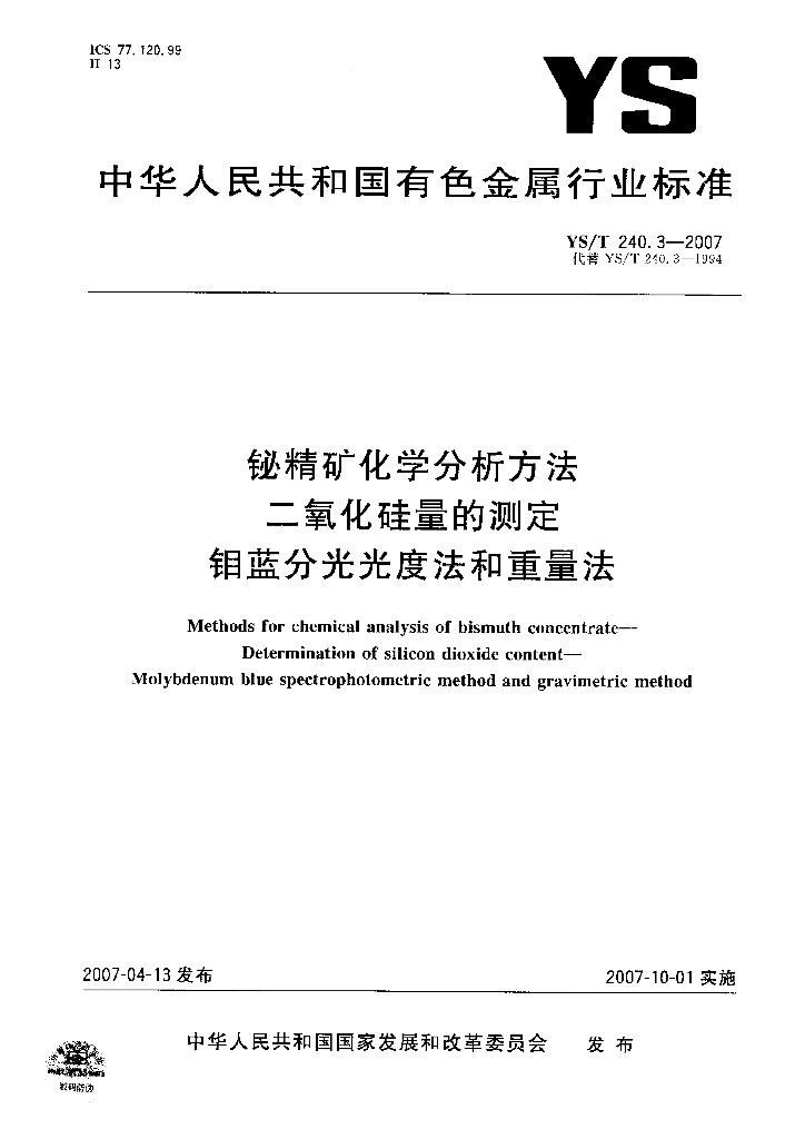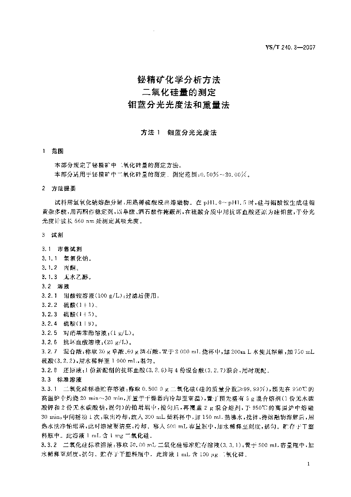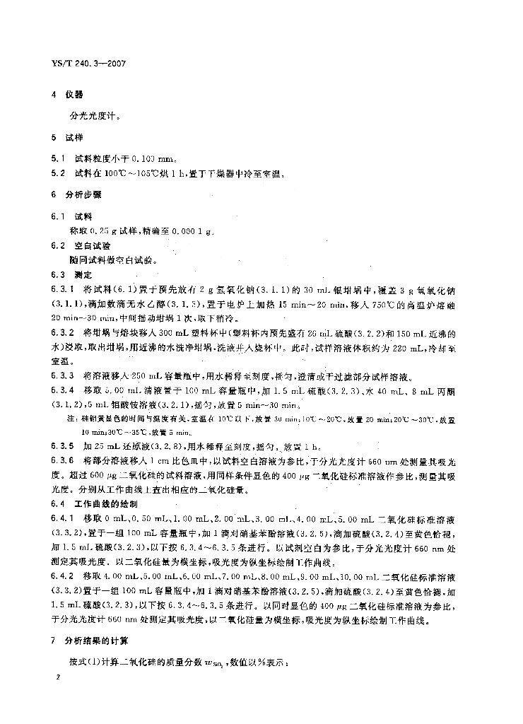 YS/T 240.3-2007 铋精矿化学分析方法 二氧化硅量的测定 钼蓝分光光度法和重量法
