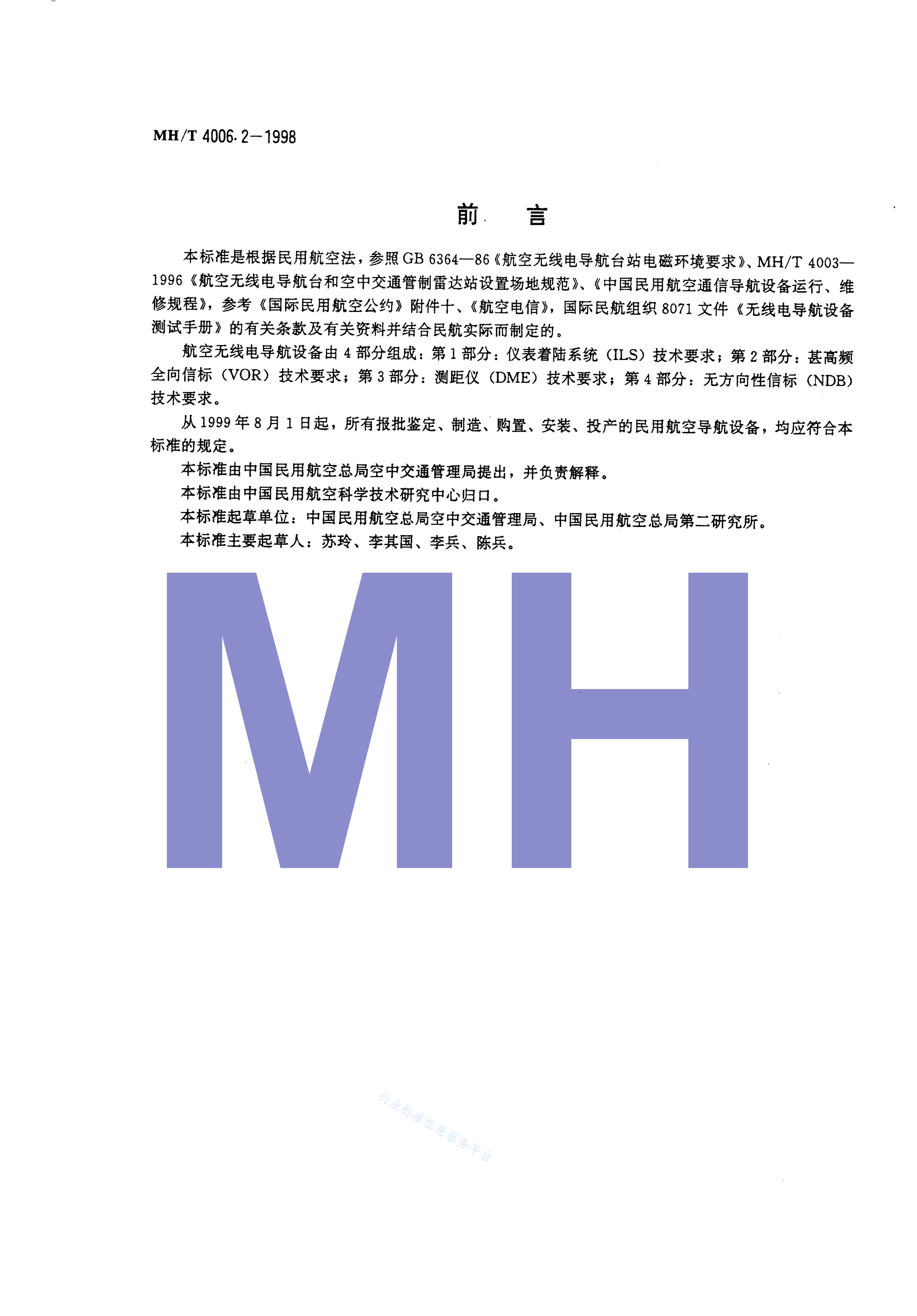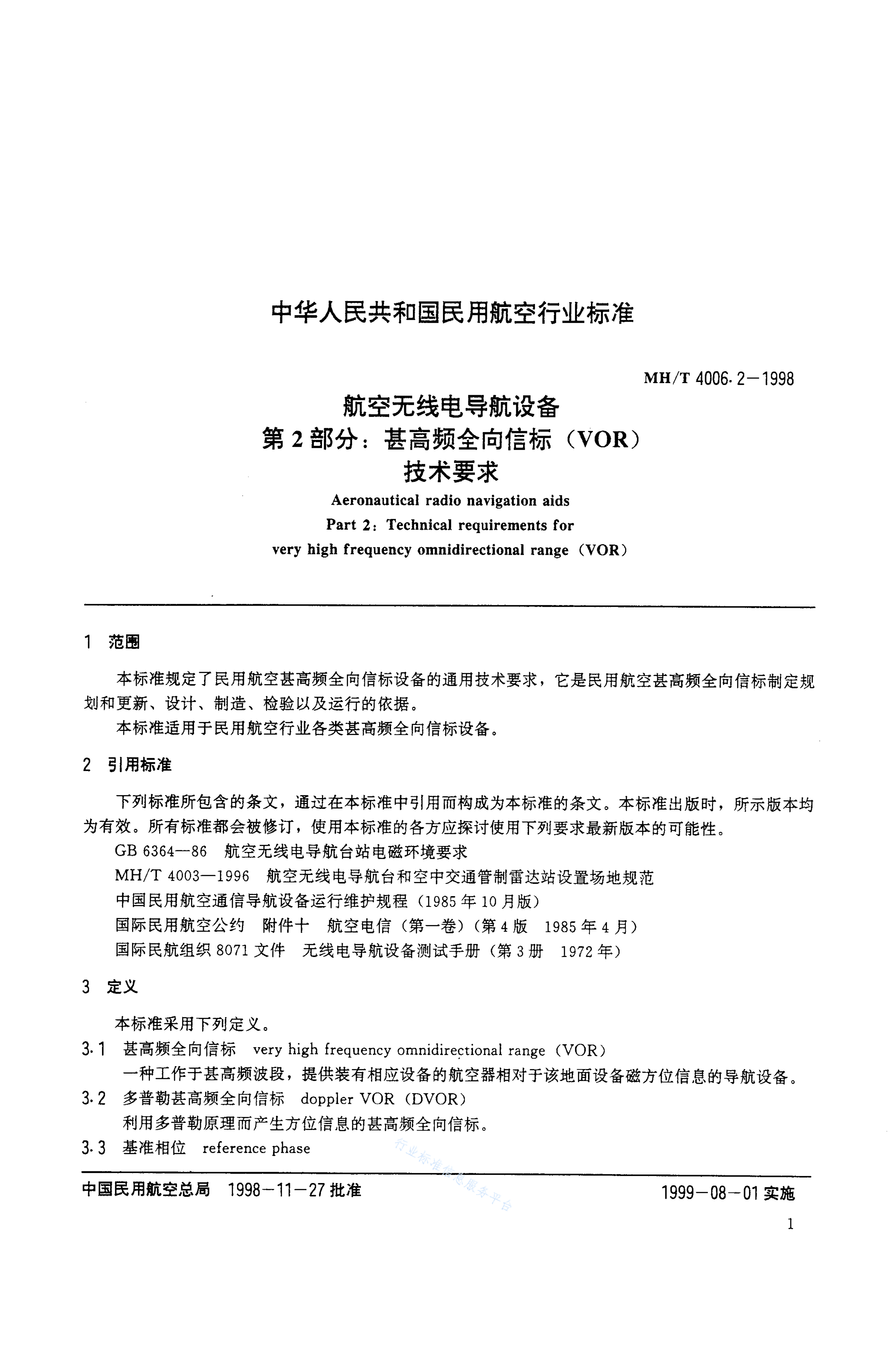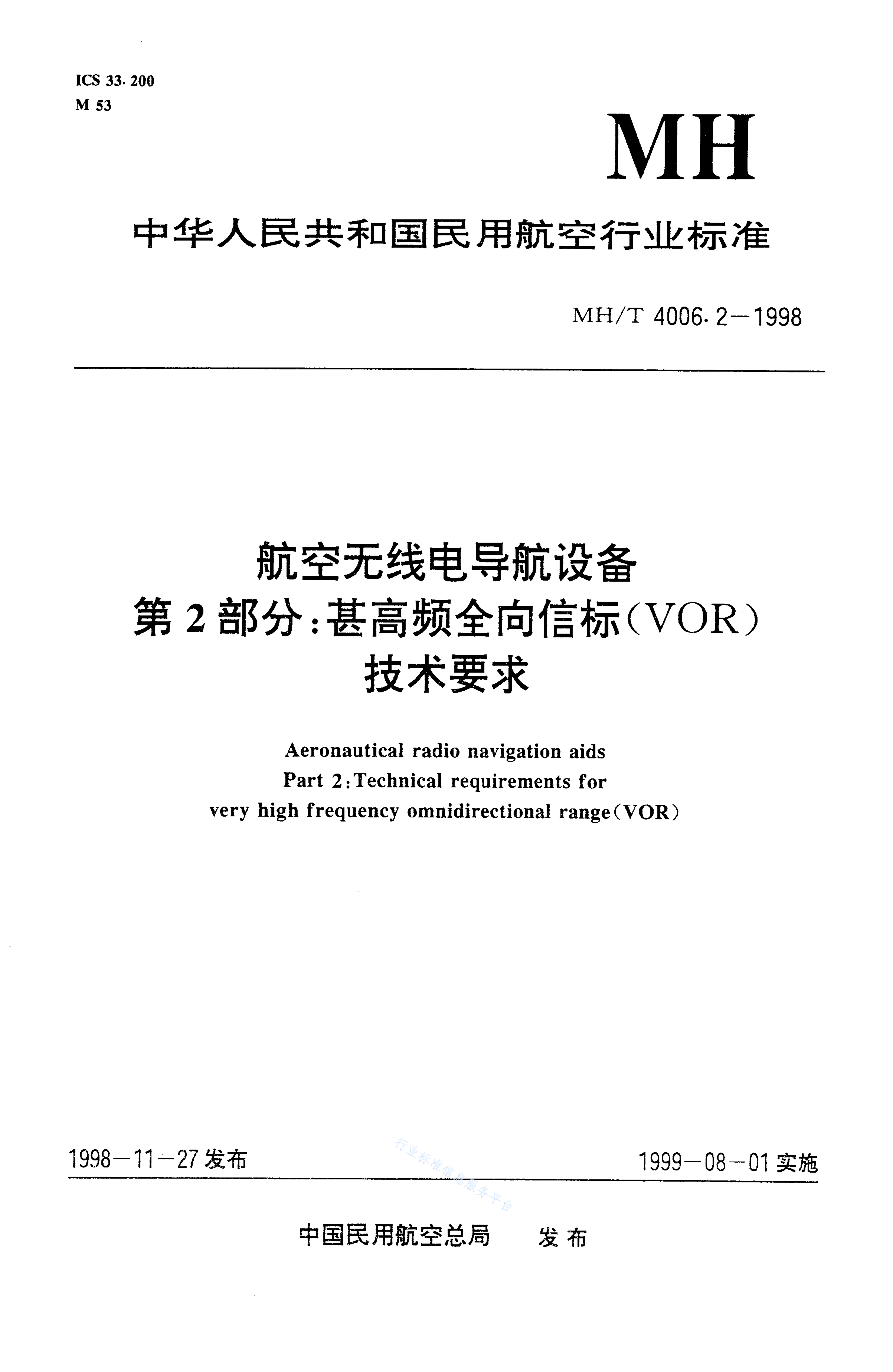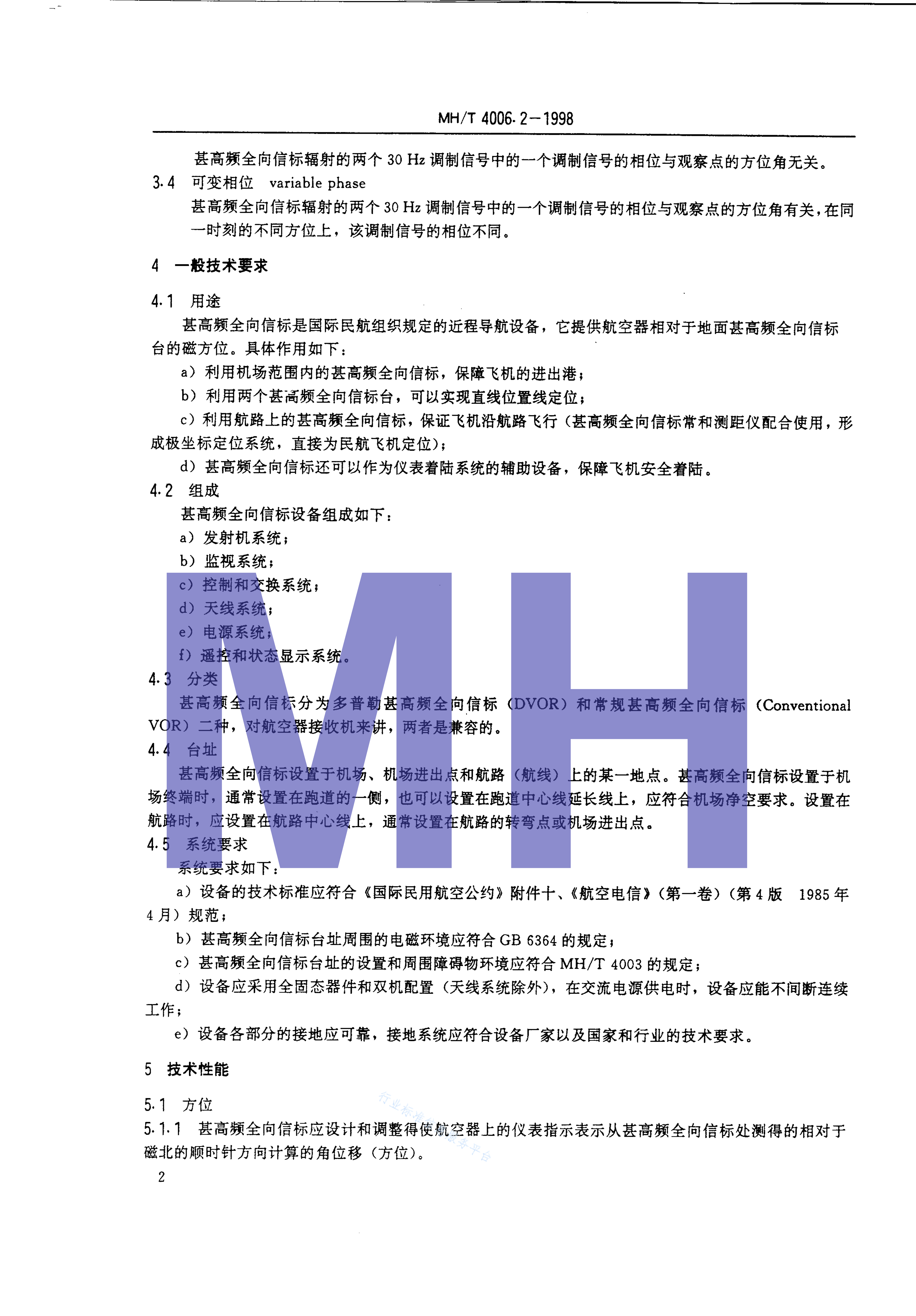 MH/T 4006.2-1998 航空无线电导航设备 第2部分:甚高频全向信标(VOR)技术要求