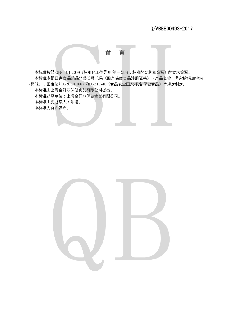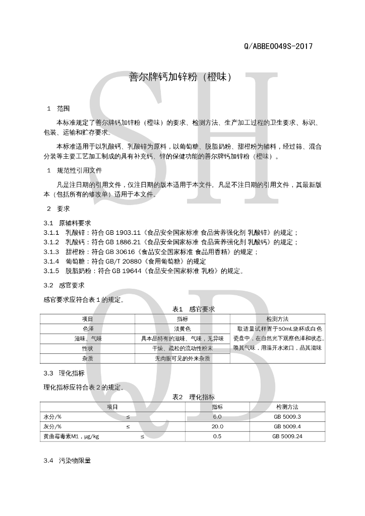 Q/ABBE 0049S-2017 善尔牌钙加锌粉(橙味)