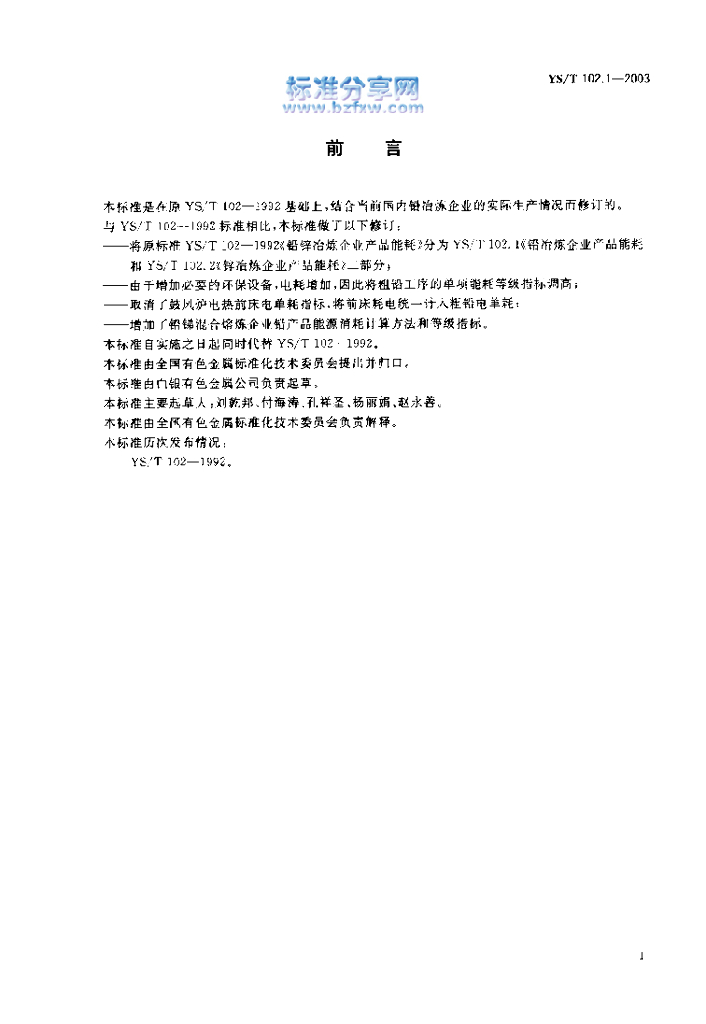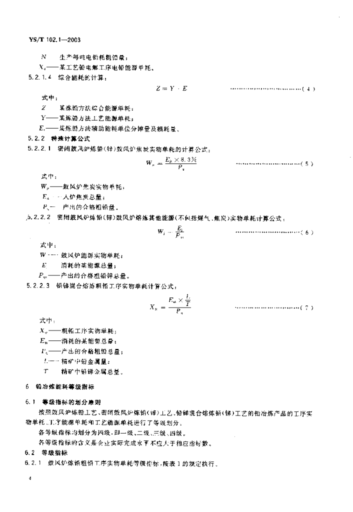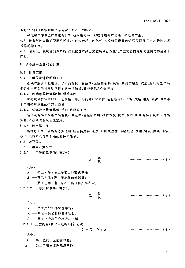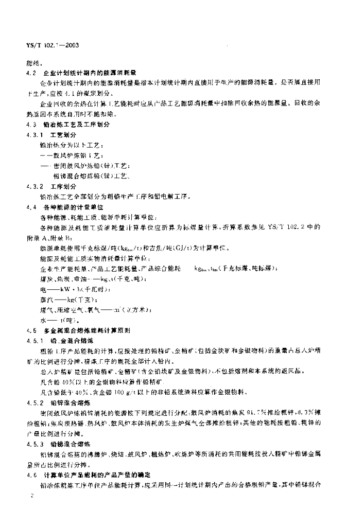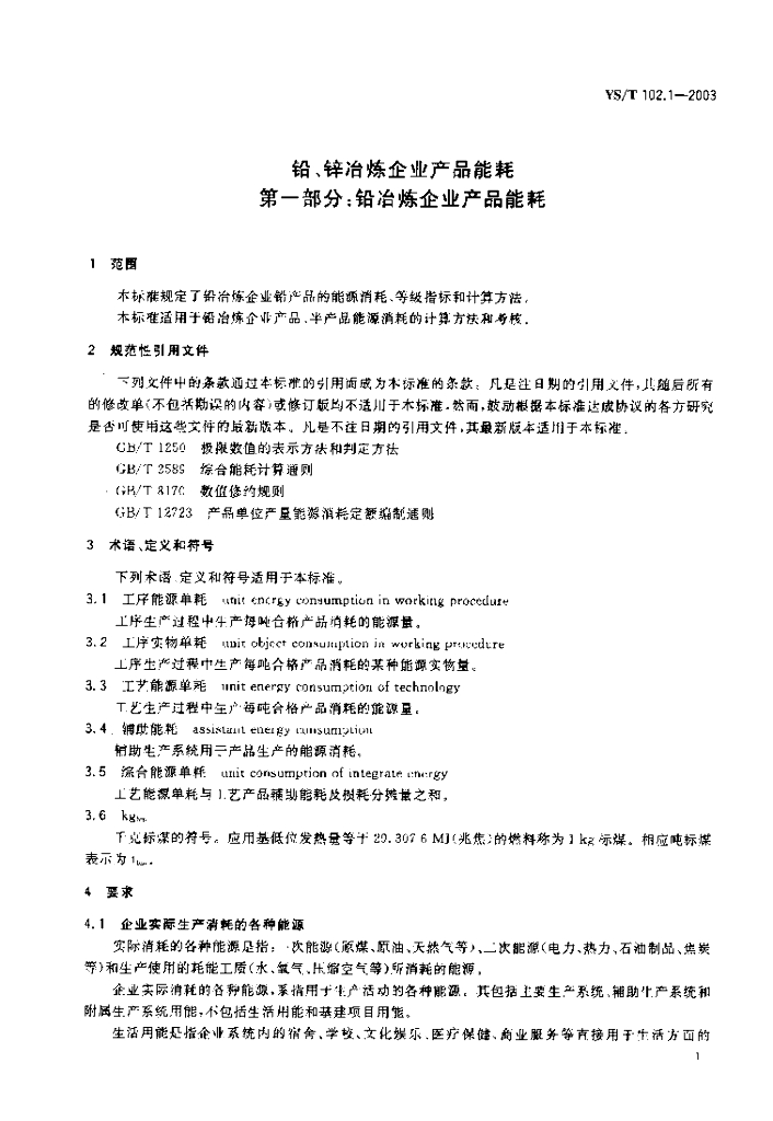 YS/T 102.1-2003 铅、锌冶炼企业产品能耗 第1部分:铅冶炼企业产品能耗