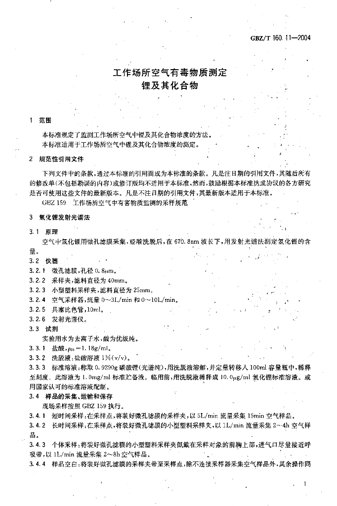 GBZ/T 160.11-2004 工作场所空气有毒物质测定 锂及其化合物