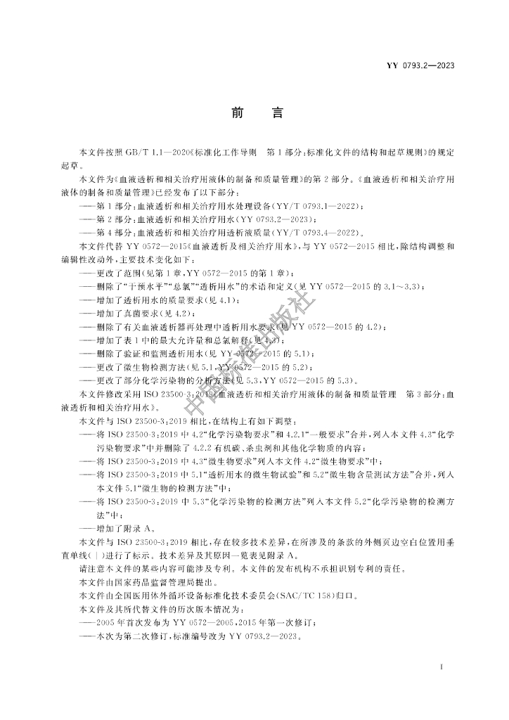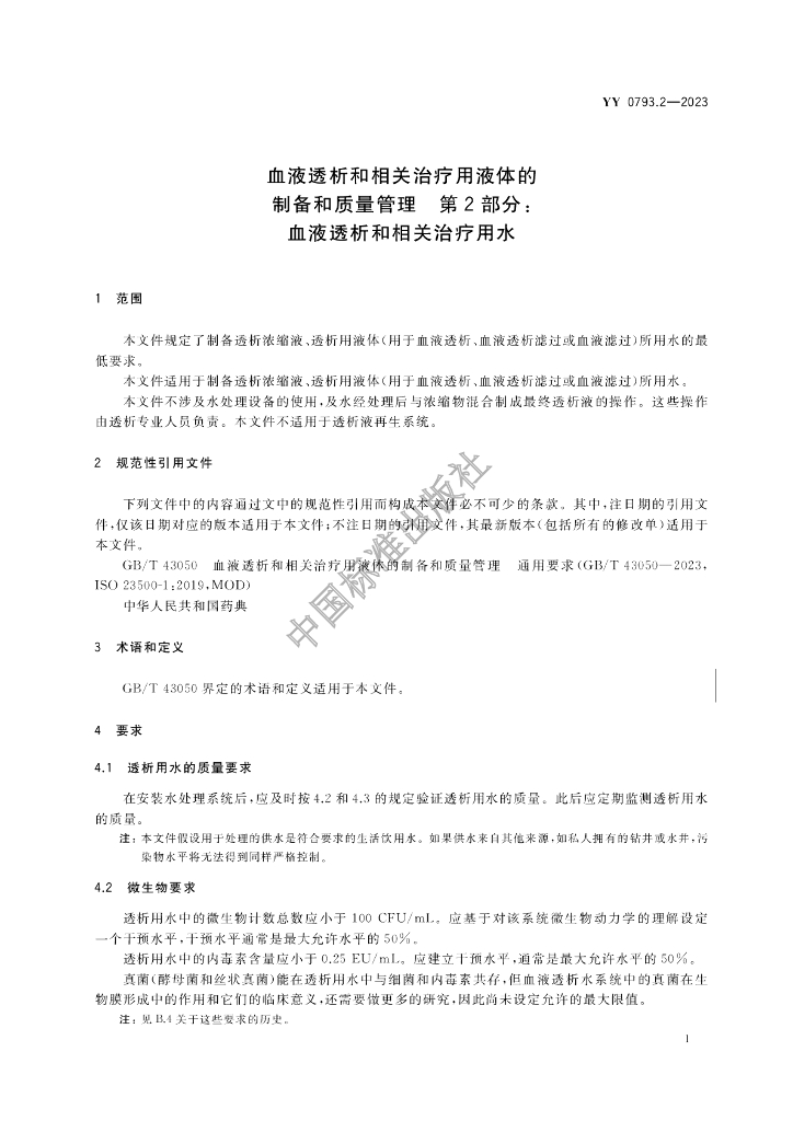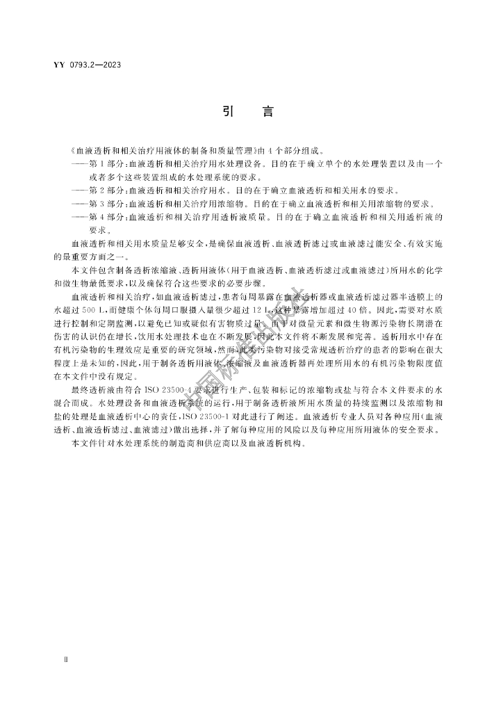 YY 0793.2-2023 血液透析和相关治疗用液体的制备和质量管理 第2部分:血液透析和相关治疗用水
