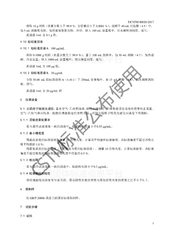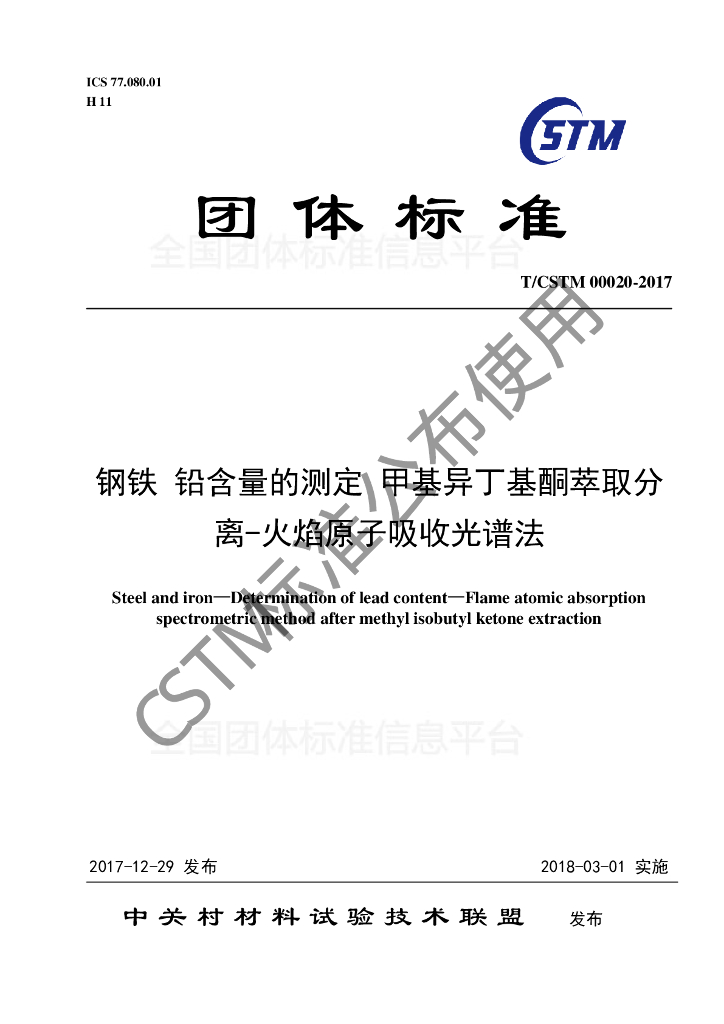 T/CSTM 00020-2017 钢铁及合金 铅含量的测定 甲基异丁基酮萃取分离-火焰原子吸收光谱法