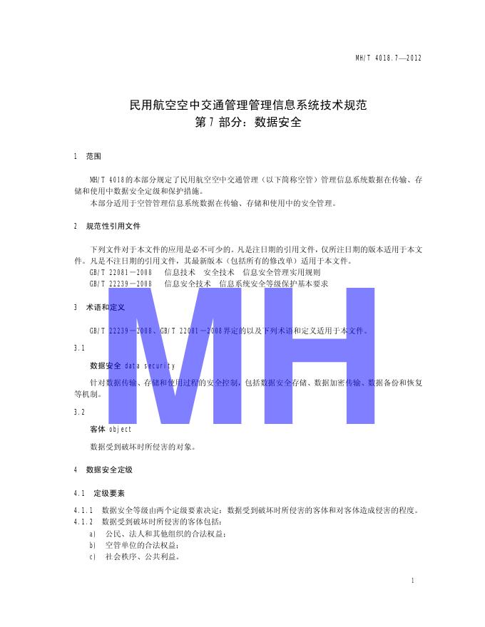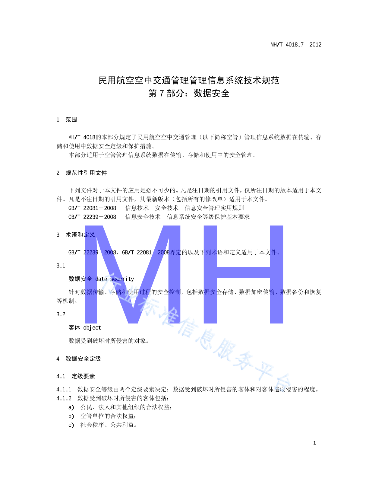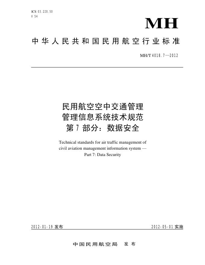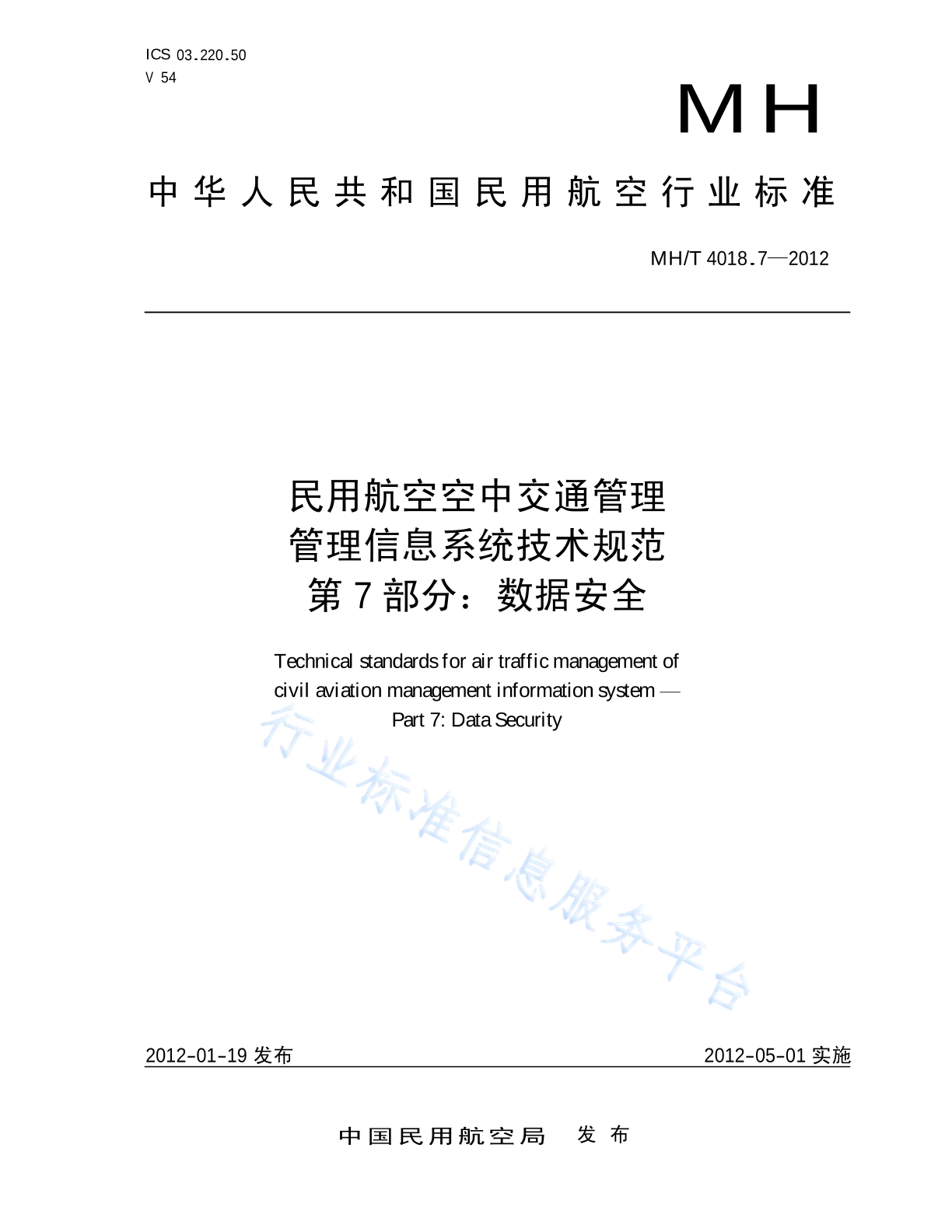 MH/T 4018.7-2012 民用航空空中交通管理管理信息系统技术规范 第7部分:数据安全