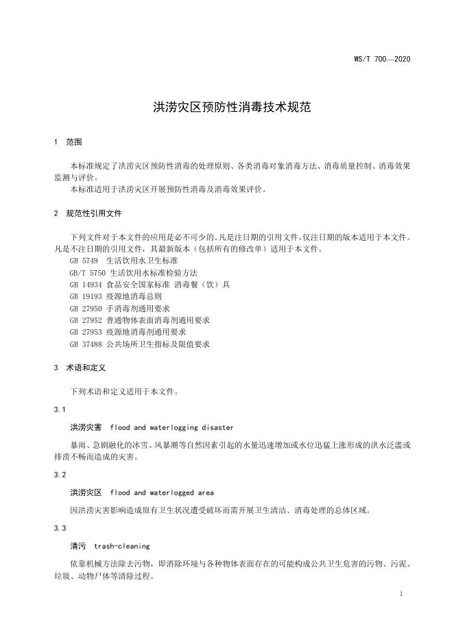 WS/T 700-2020 洪涝灾区预防性消毒技术规范