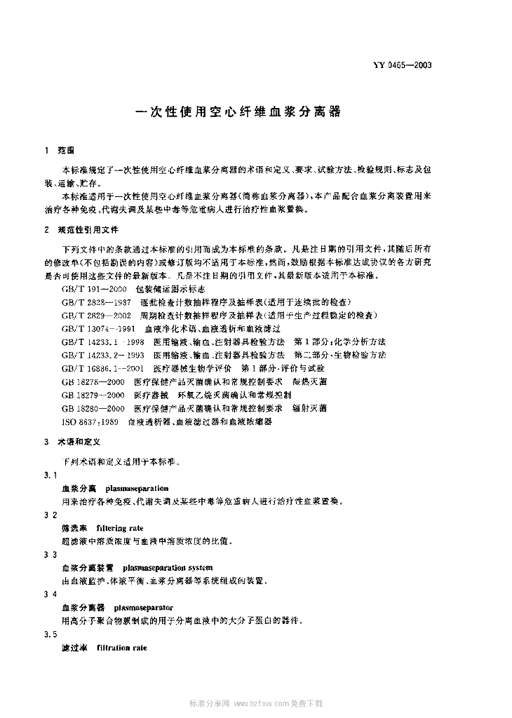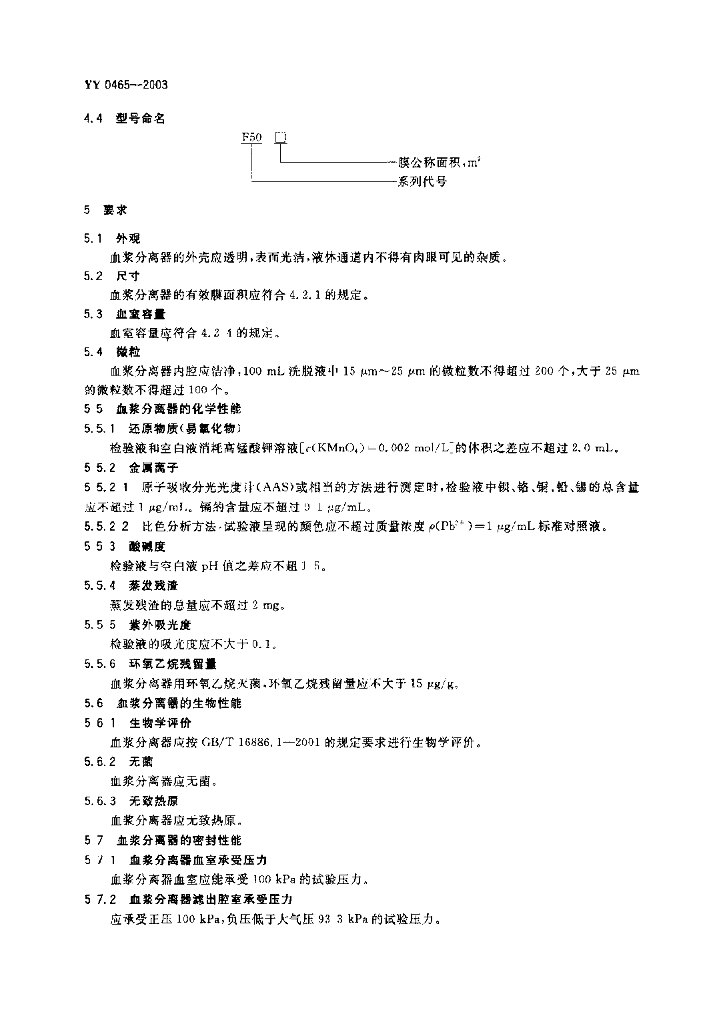 YY 0465-2003 一次性使用空心纤维血浆分离器