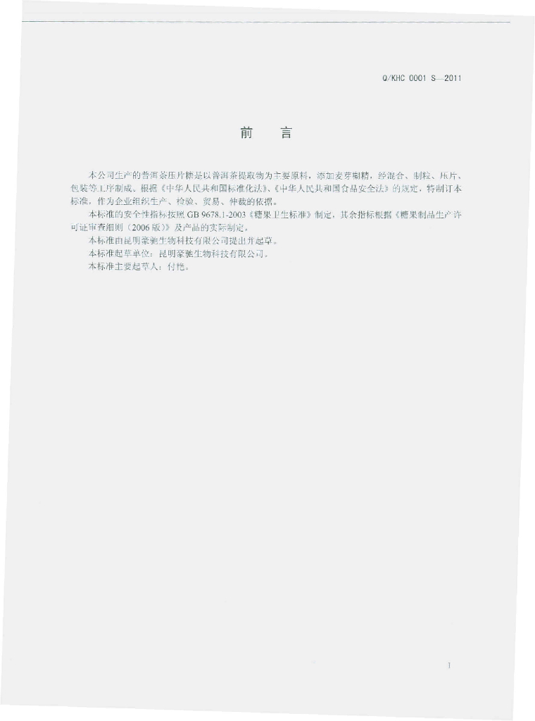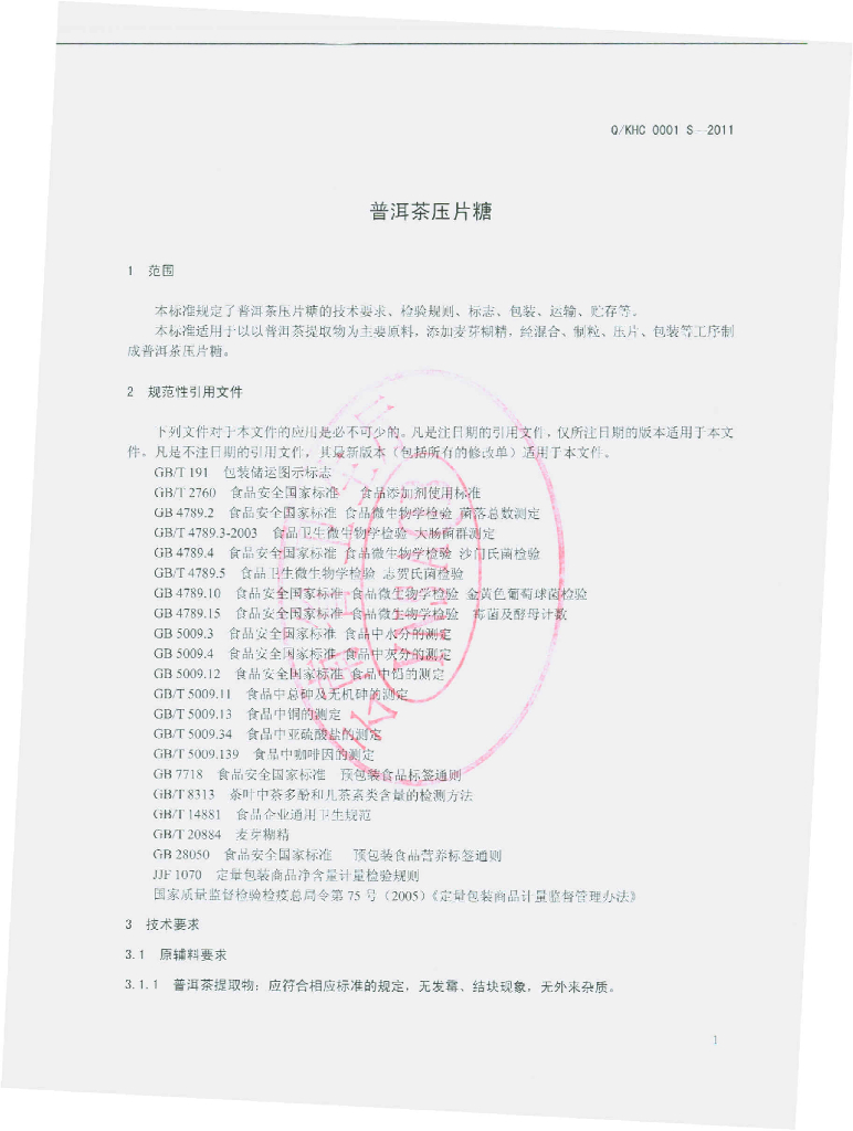Q/KHC 0001S-2011 普洱茶压片糖