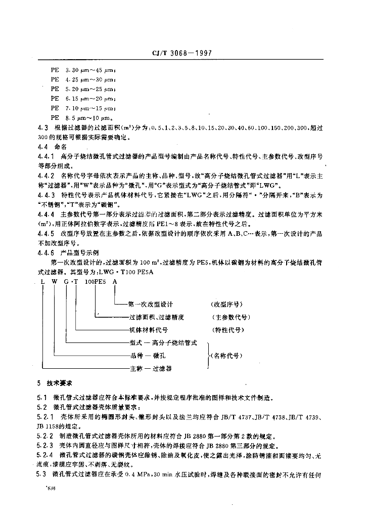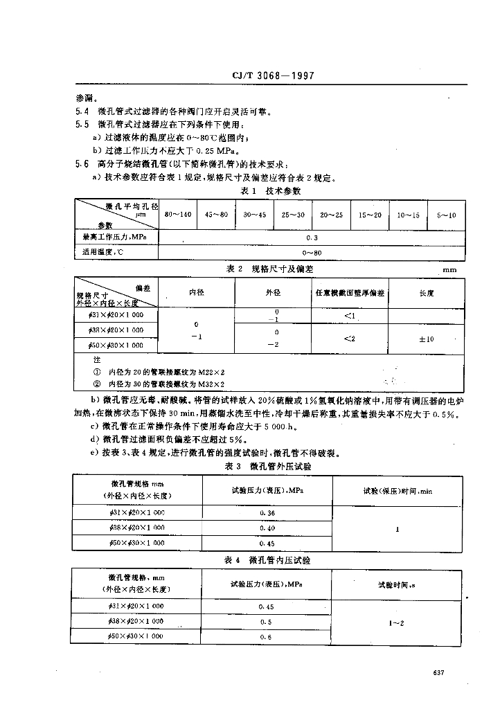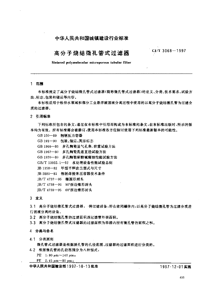 CJ/T 3068-1997 高分子烧结微孔管式过滤器