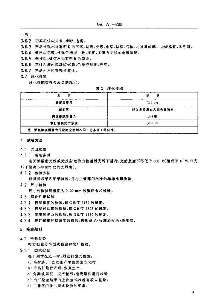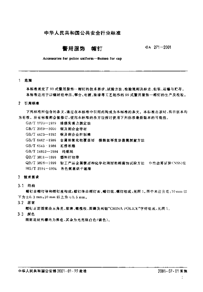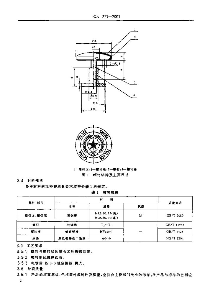 GA 271-2001 警用服饰帽钉