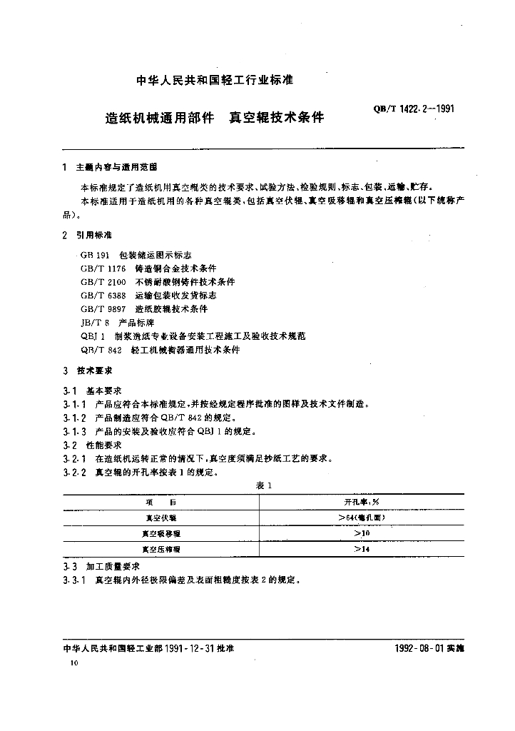QB/T 1422.2-1991 造纸机械通用部件真空棍技术条件