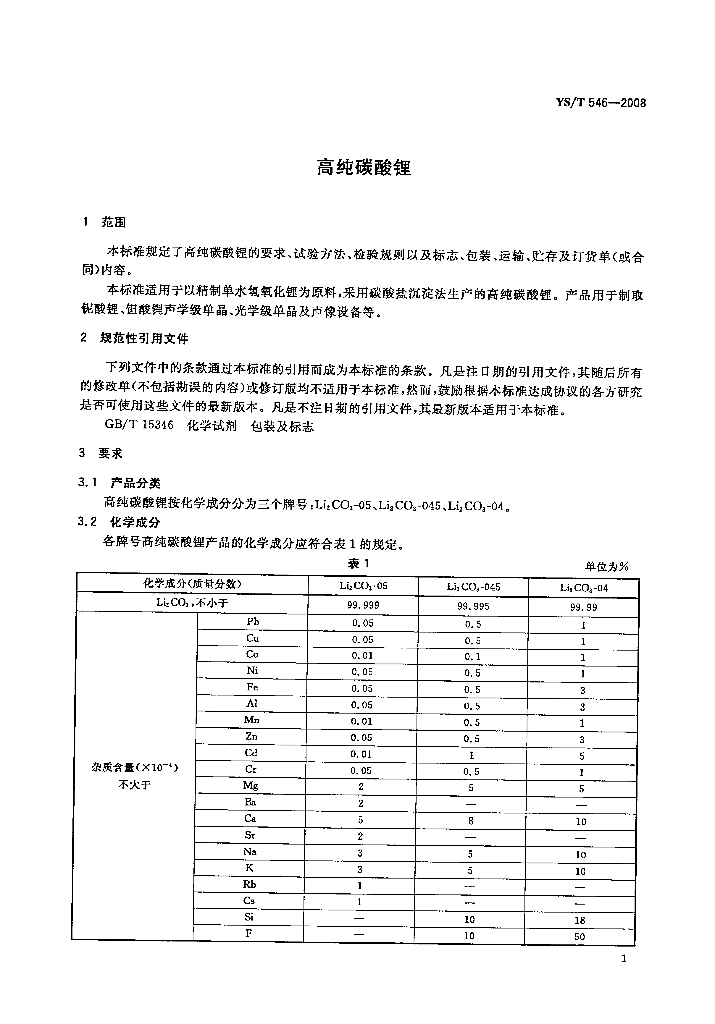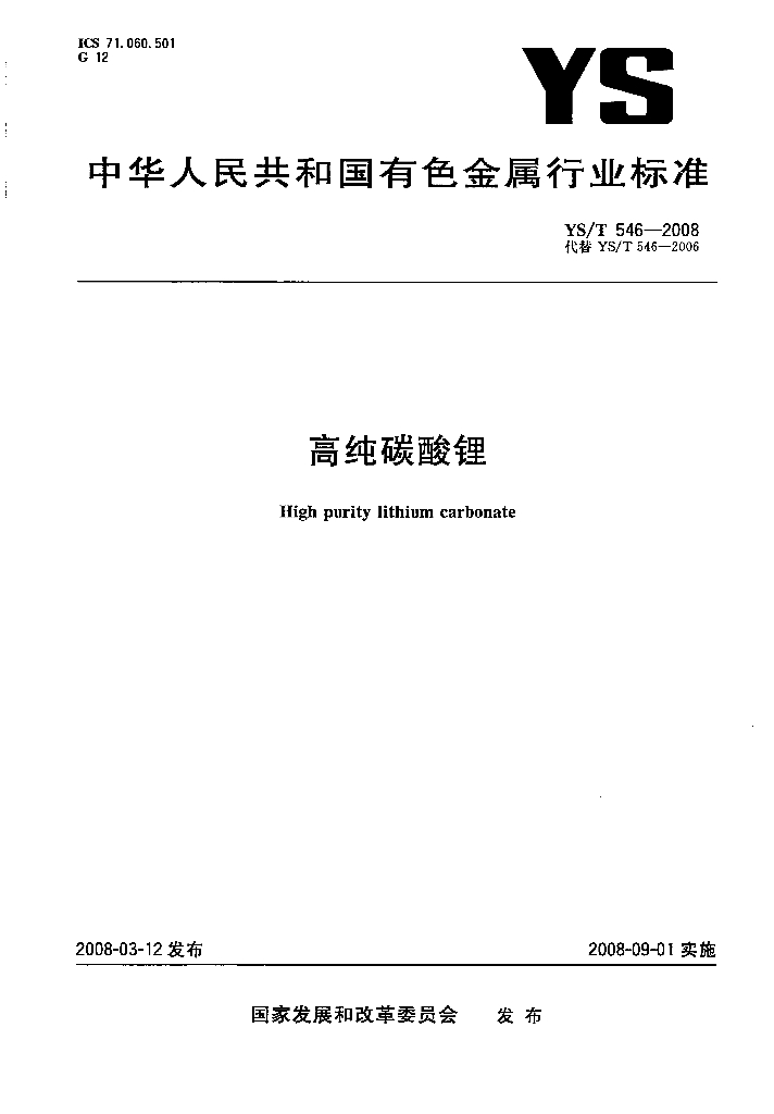 YS/T 546-2008 高纯碳酸锂