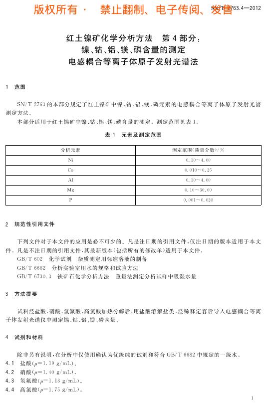 SN/T 2763.4-2012 红土镍矿化学分析方法 第4部分:镍、钴、铝、镁、磷含量的测定 电感耦合等离子体原子发射光谱法