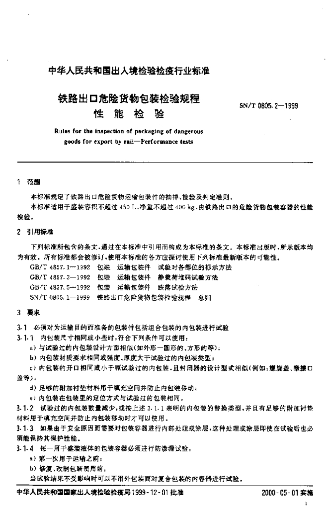 SN/T 0805.2-1999 铁路出口危险货物包装检验规程 性能检验
