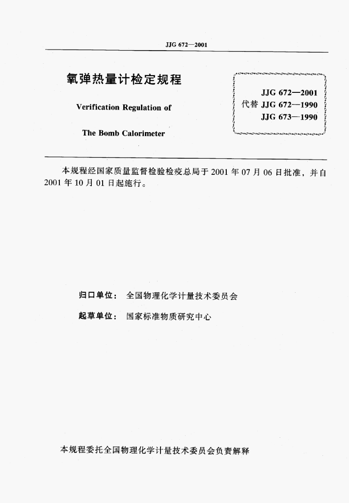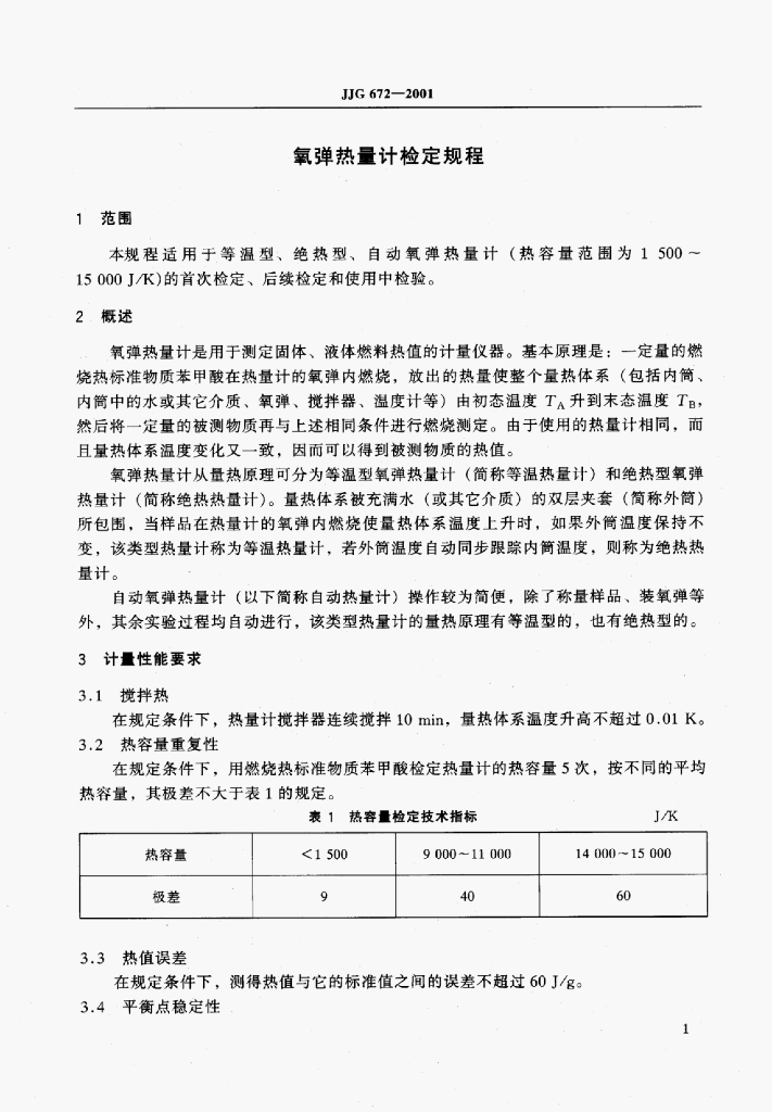 JJG 672-2001 氧弹热量计检定规程