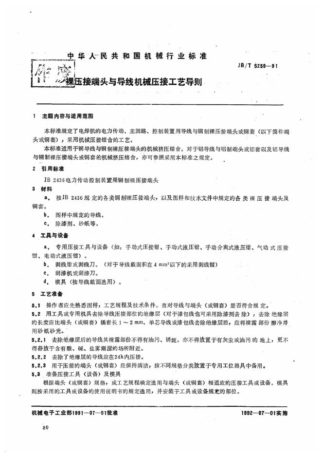 JB/T 5259-1991 裸压接头与导线机械压接工艺导则