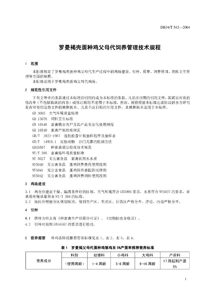 DB34/T 542-2005 罗曼褐壳蛋种鸡父母代饲养管理技术规程