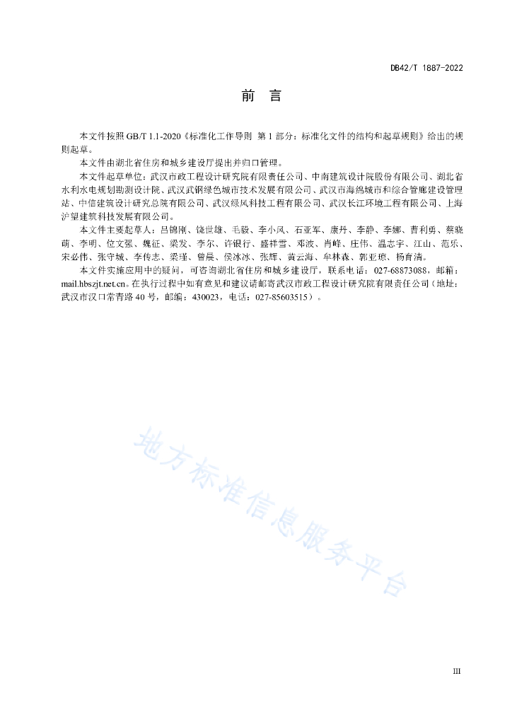 武汉市政工程设计研究院有限责任公司、中南建筑设计院股份有限公司、湖北省水利水电规划勘测设计院、武汉武钢绿色城市技术发展有限公司、武汉市海绵城市和综合管廊建设管理站、中信建筑设计研究总院有限公司、武汉绿风科技工程有限公司、武汉长江环境工程有限公司、上海沪望建筑科技发展有限公司
