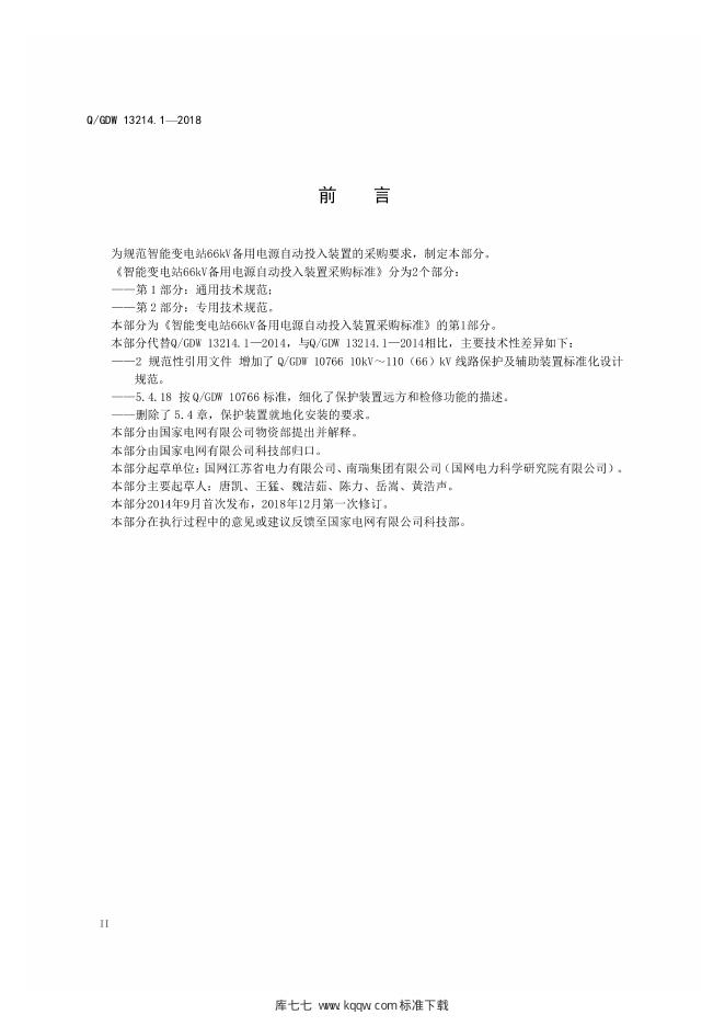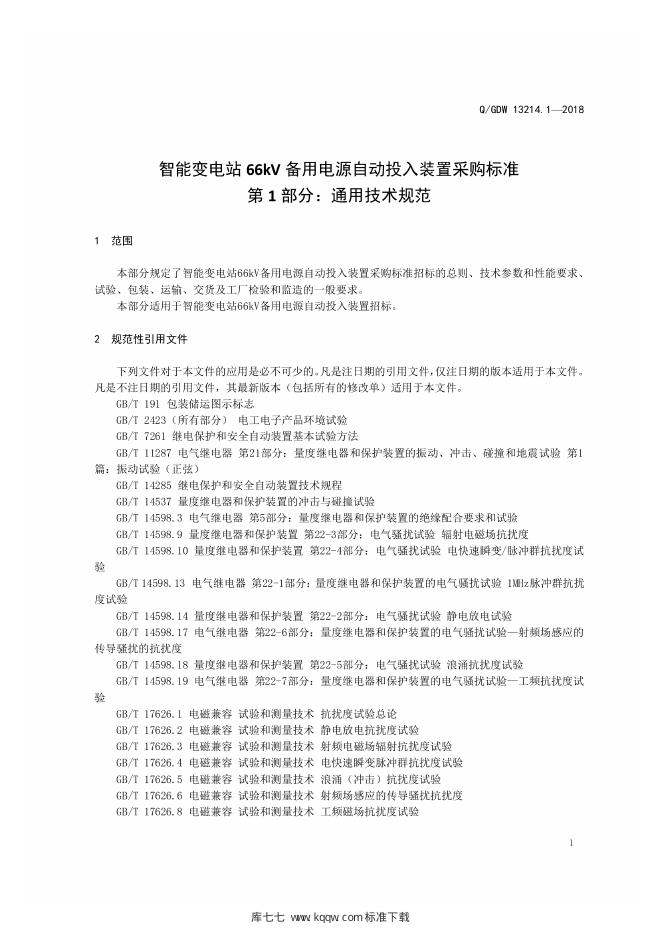 Q/GDW 13214.1-2018 智能变电站66kV备用电源自动投入装置采购标准 第1部分:通用技术规范