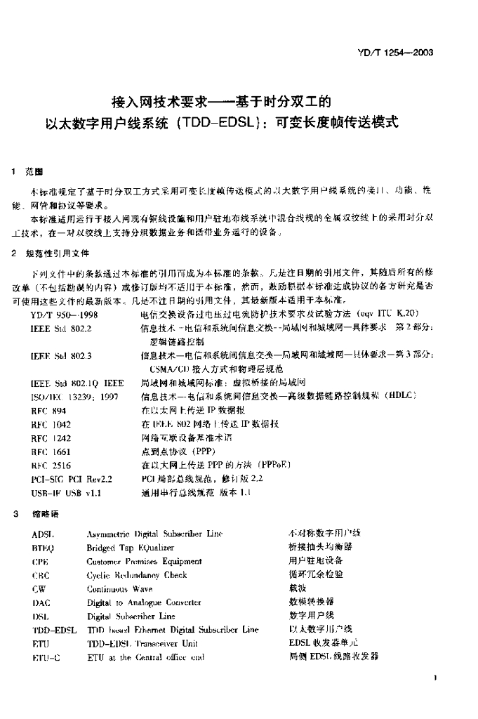 YD/T 1254-2003 接入网技术要求基于时分双工的以太数字用户线系统(TDD-EDSL):可变长度帧传送模式