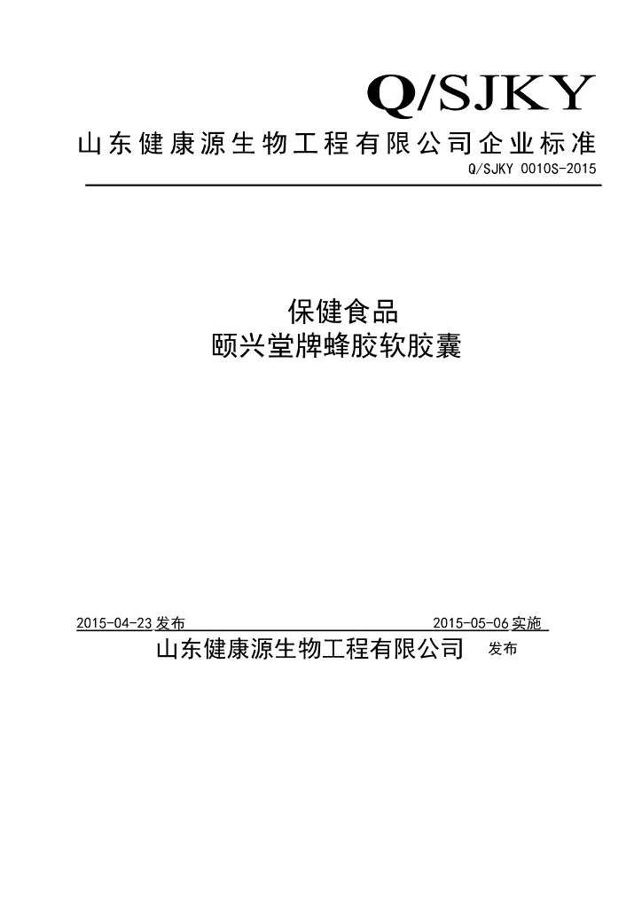 Q/SJKY 0010S-2015 山东健康源生物工程有限公司 保健食品颐兴堂牌蜂胶软胶囊